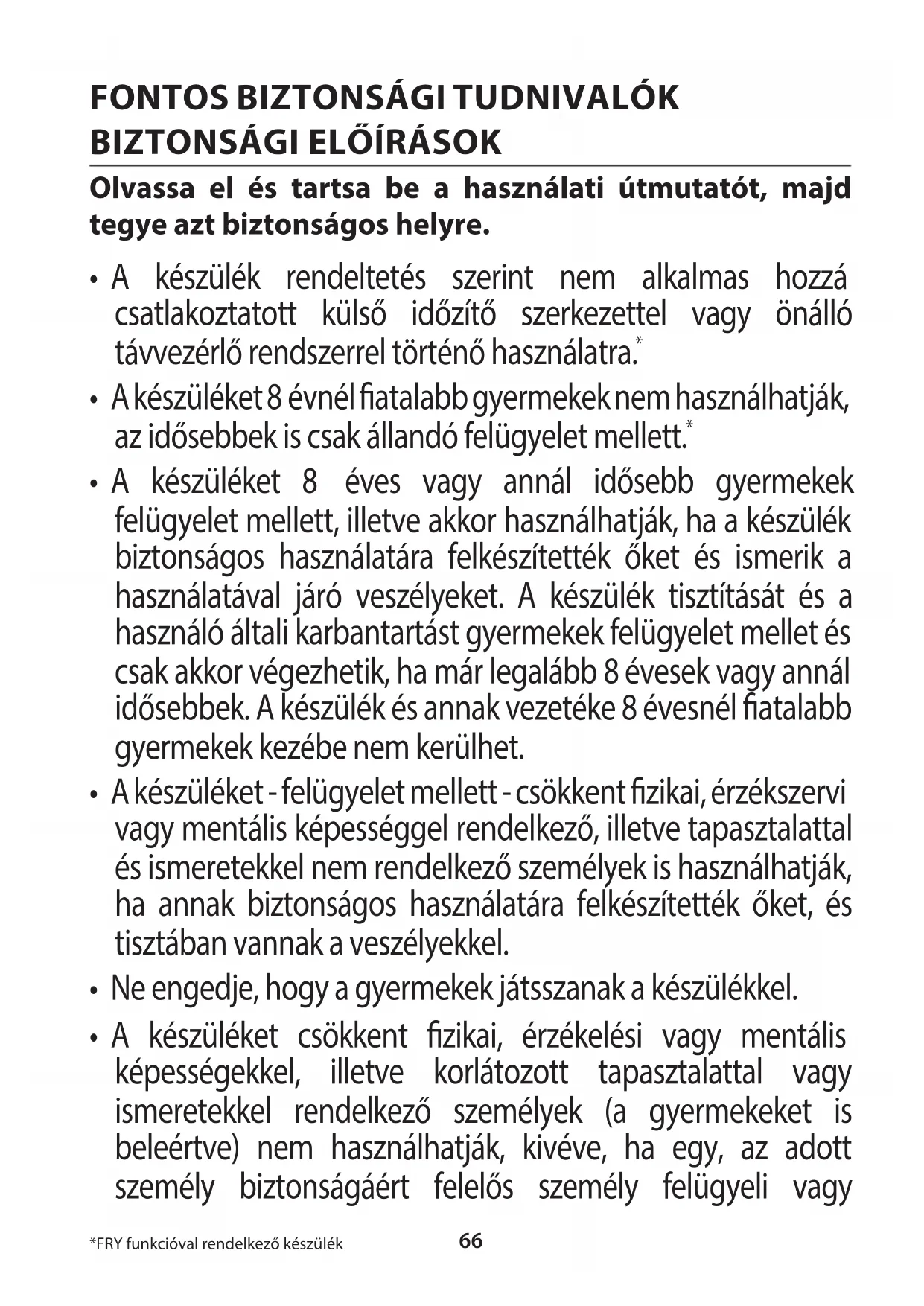 - A készüléket csökkent zikai, érzékelési vagy mentális képességekkel, illetve korlátozott tapasztalattal vagy ismeretekkel rendelkező személyek (a gyermekeket is beleértve) nem használhatják, kivéve, ha egy, az adott személy biztonságáért felelős személy felügyeli vagy *FRY funkcióval rendelkező készülék67