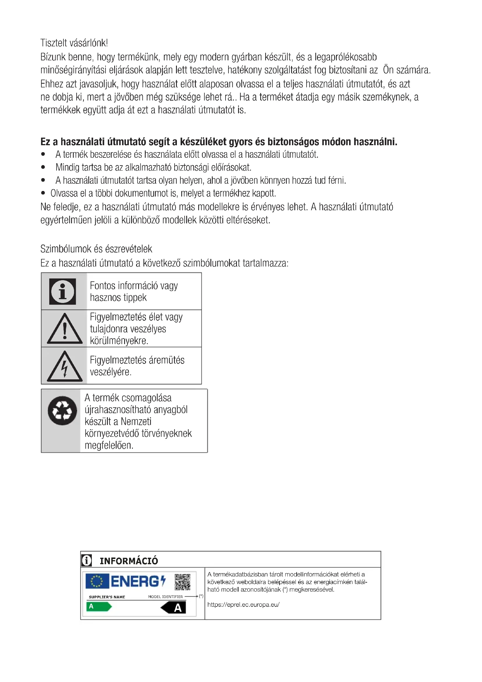Figyelmeztetés áremütés veszélyére. A termék csomagolása újrahasznosítható anyagból készült a Nemzeti környezetvédő törvényeknek megfelelően. INFORMÁCIÓ A termékadatbázisban tárolt modellinformációkat elérheti a következő weboldalra belépéssel és az energiacímkén talál-ható modell azonosítójának (*) megkeresésével.https://eprel.ec.europa.eu/