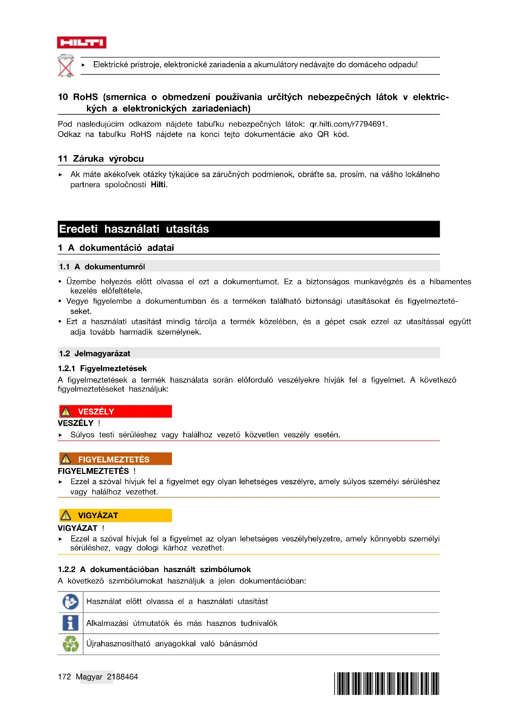 A következő szimbólumokat használjuk a jelen dokumentációban: Használat előtt olvassa el a használati utasítást Alkalmazási útmutatók és más hasznos tudnivalók Újrahasznosítható anyagokkal való bánásmód*2188464* 2188464 Magyar 173 Az elektromos gépeket és akkukat ne dobja a háztartási szemétbe