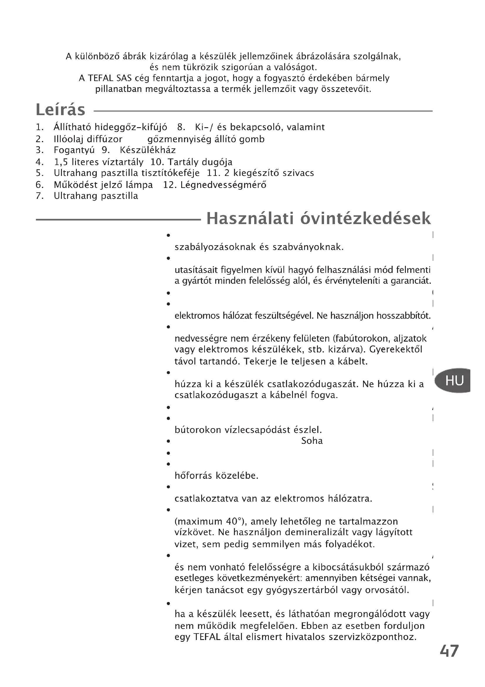 - A Tefal cég nem garantálja a kibocsátott illatok minőségét, és nem vonható felelősségre a kibocsátásukból származó esetleges következményekért: amennyiben kétségei vannak, kérjen tanácsot egy gyógyszertárból vagy orvosától.
