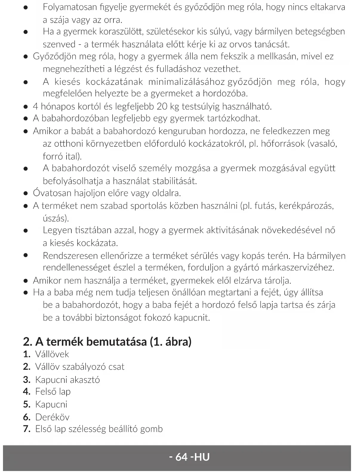A gyermek álla nem feküdhet a babahordozót viselő személy mellkasán, mivel ez a légutak részleges elzáródását okozza. A hordozót viselő személynek folyamatosan gyelnie kell arra, hogy a baba légútjai szabadok maradjanak és a gyermek megfelelően lélegezzen. Helyezze a babát megfelelően a hordozóba, ügyelve a lábak egészséges helyzetére. Rendszeresen ellenőrizze, hogy a baba megfelelő helyzetben van - a babahordozó közepén, szélesen széárt lábakkal és egyenesen tarto fejjel, nem lefelé vagy oldalra hajto fejjel. Rendszeresen gyelje a baba kezeit, lábait és lábfejeit, hogy megbizonyosodjon arról, hogy a babahordozó eszköz nem szorítja be őket. A gyermek babahordozóba helyezésének elsajátása során, a gyermek sérülésének elkerülése érdekében a behelyezést egy ágyon vagy más puha felületen kell elvégezni egy másik felnő személy segítségével. Amikor csak lehetséges, a baba számára biztonságos felület közelében és biztonságos helyen vegye fel és vegye le a babahordozót. Kellő körültekintéssel kell eljárni, ha a babát a hátán hordozza. A babahordozót nem használhatják olyan egészségügyi problémákban szenvedő személyek, akik esetében ez a probléma negavan befolyásolhatná a termék biztonságos használatát. Ha váll-, hát- vagy nyakproblémákat tapasztal, fejezze be a hordozó használatát és forduljon orvoshoz.