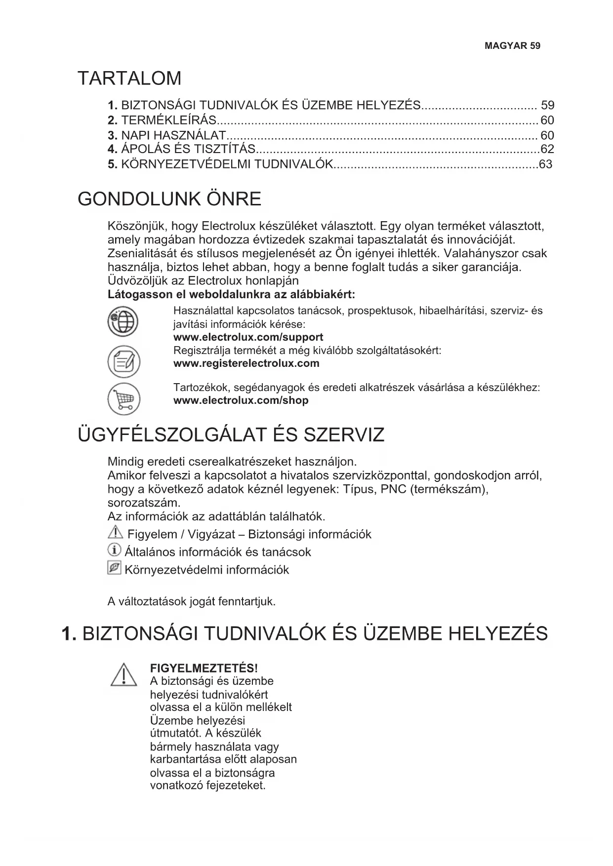 GONDOLUNK ÖNRE Köszönjük, hogy Electrolux készüléket választott. Egy olyan terméket választott, amely magában hordozza évtizedek szakmai tapasztalatát és innovációját. Zsenialitását és stílusos megjelenését az Ön igényei ihlették. Valahányszor csak használja, biztos lehet abban, hogy a benne foglalt tudás a siker garanciája. Üdvözöljük az Electrolux honlapján Látogasson el weboldalunkra az alábbiakért: Használattal kapcsolatos tanácsok, prospektusok, hibaelhárítási, szerviz- és javítási információk kérése: www.electrolux.com/support Regisztrálja termékét a még kiválóbb szolgáltatásokért: www.registerelectrolux.com Tartozékok, segédanyagok és eredeti alkatrészek vásárlása a készülékhez: www.electrolux.com/shop