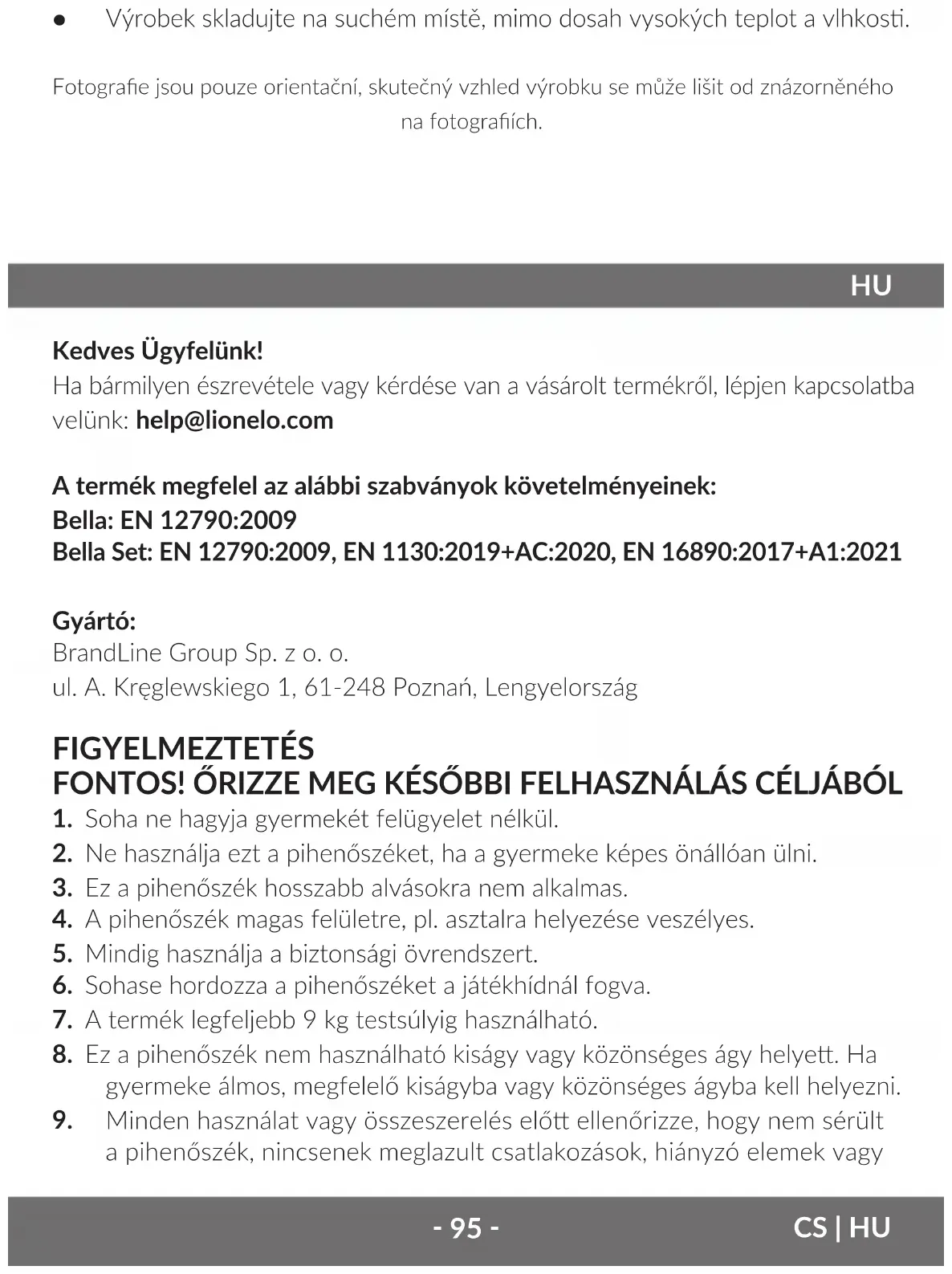 Kedves Ügyfelünk! Ha bármilyen észrevétele vagy kérdése van a vásárolt termékről, lépjen kapcsolatba velünk: help@lionelo.com A termék megfelel az alábbi szabványok követelményeinek: Bella: EN 12790:2009 Bella Set: EN 12790:2009, EN 1130:2019+AC:2020, EN 16890:2017+A1:2021 Gyártó: BrandLine Group Sp. z o. o. ul. A. Kręglewskiego 1, 61-248 Poznań, Lengyelország FIGYELMEZTETÉS FONTOS! ŐRIZZE MEG KÉSŐBBI FELHASZNÁLÁS CÉLJÁBÓL