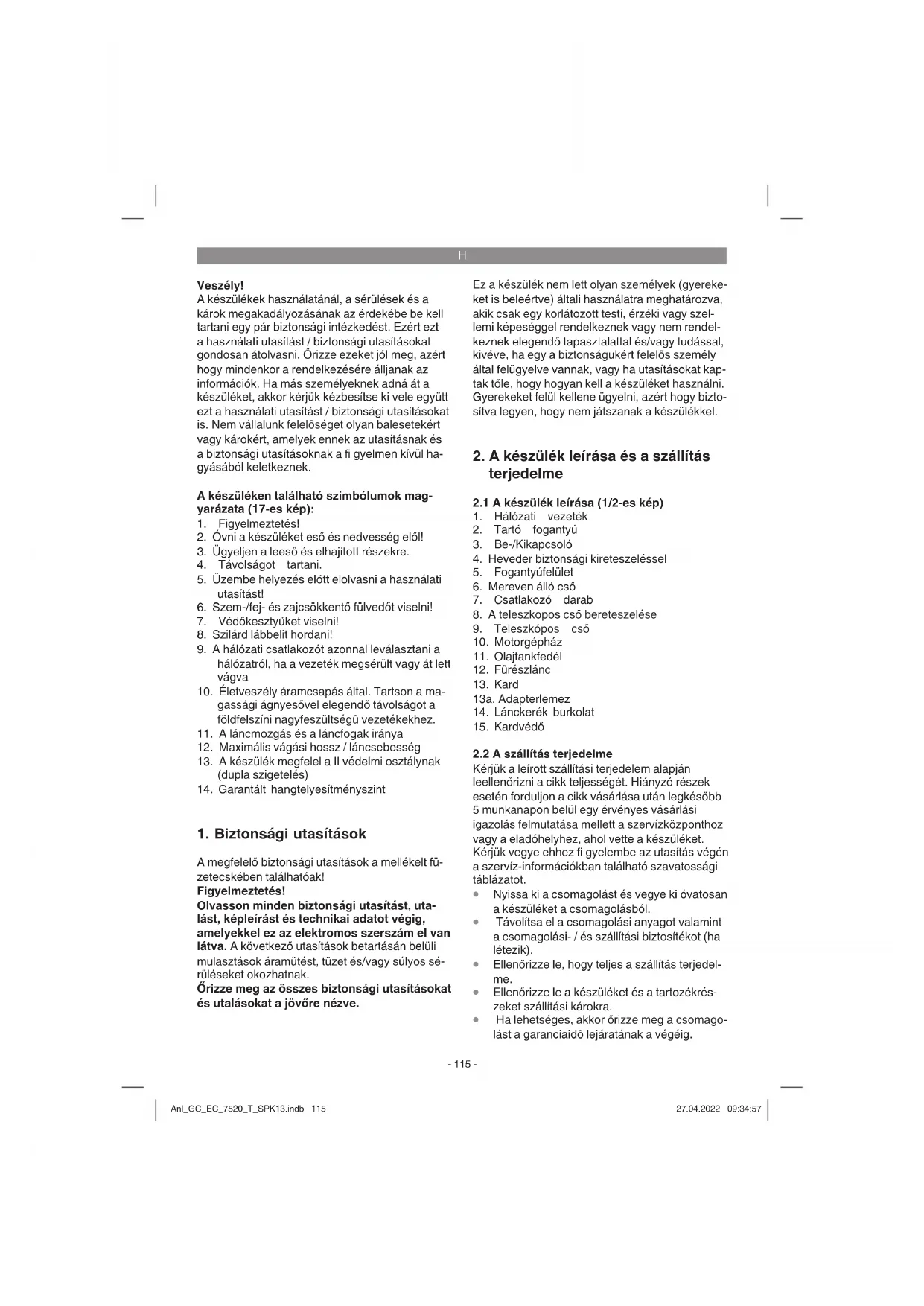 Az elektromos-magassági ágnyesővel csak akkor lehetséges eff ektiven dolgozni, ha a fűrészlánc jó állapotban van és éles. Ezáltal a visszacsapódás veszélye is lecsökken. Anl_GC_EC_7520_T_SPK13.indb 120Anl_GC_EC_7520_T_SPK13.indb 120 27.04.2022 09:34:5827.04.2022 09:34:58H