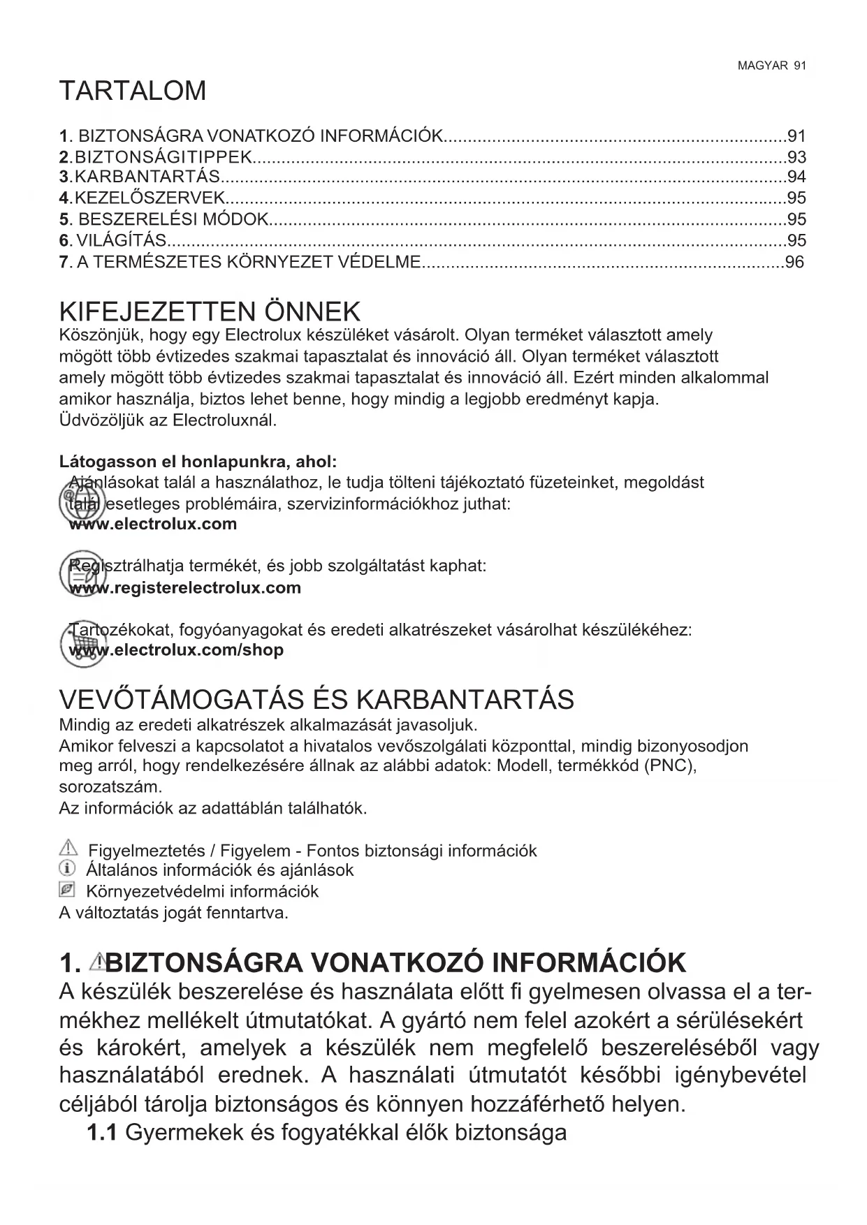 KIFEJEZETTEN ÖNNEK Köszönjük, hogy egy Electrolux készüléket vásárolt. Olyan terméket választott amely mögött több évtizedes szakmai tapasztalat és innováció áll. Olyan terméket választott amely mögött több évtizedes szakmai tapasztalat és innováció áll. Ezért minden alkalommal amikor használja, biztos lehet benne, hogy mindig a legjobb eredményt kapja. Üdvözöljük az Electroluxnál. Látogasson el honlapunkra, ahol: Ajánlásokat talál a használathoz, le tudja tölteni tájékoztató füzeteinket, megoldást talál esetleges problémáira, szervizinformációkhoz juthat: www.electrolux.com Regisztrálhatja termékét, és jobb szolgáltatást kaphat: www.registerelectrolux.com Tartozékokat, fogyóanyagokat és eredeti alkatrészeket vásárolhat készülékéhez: www.electrolux.com/shop VEVŐTÁMOGATÁS ÉS KARBANTARTÁS Mindig az eredeti alkatrészek alkalmazását javasoljuk. Amikor felveszi a kapcsolatot a hivatalos vevőszolgálati központtal, mindig bizonyosodjon meg arról, hogy rendelkezésére állnak az alábbi adatok: Modell, termékkód (PNC), sorozatszám. Az információk az adattáblán találhatók. Figyelmeztetés / Figyelem - Fontos biztonsági információk Általános információk és ajánlások Környezetvédelmi információk A változtatás jogát fenntartva.