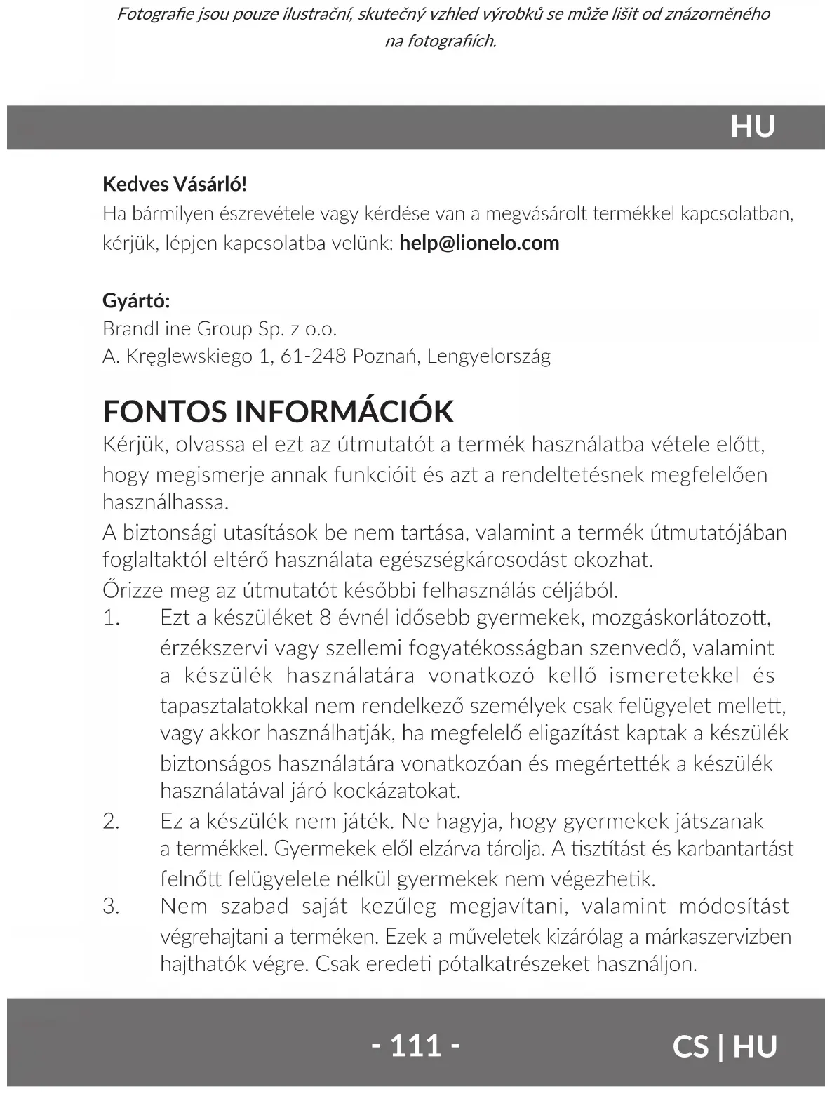 - Pokud bolest nebo nepohodlí přetrvává, poraďte se s lékařem.‑ 111 ‑ CS | HU Kedves Vásárló! Ha bármilyen észrevétele vagy kérdése van a megvásárolt termékkel kapcsolatban, kérjük, lépjen kapcsolatba velünk: help@lionelo.com Gyártó: BrandLine Group Sp. z o.o. A. Kręglewskiego 1, 61-248 Poznań, Lengyelország