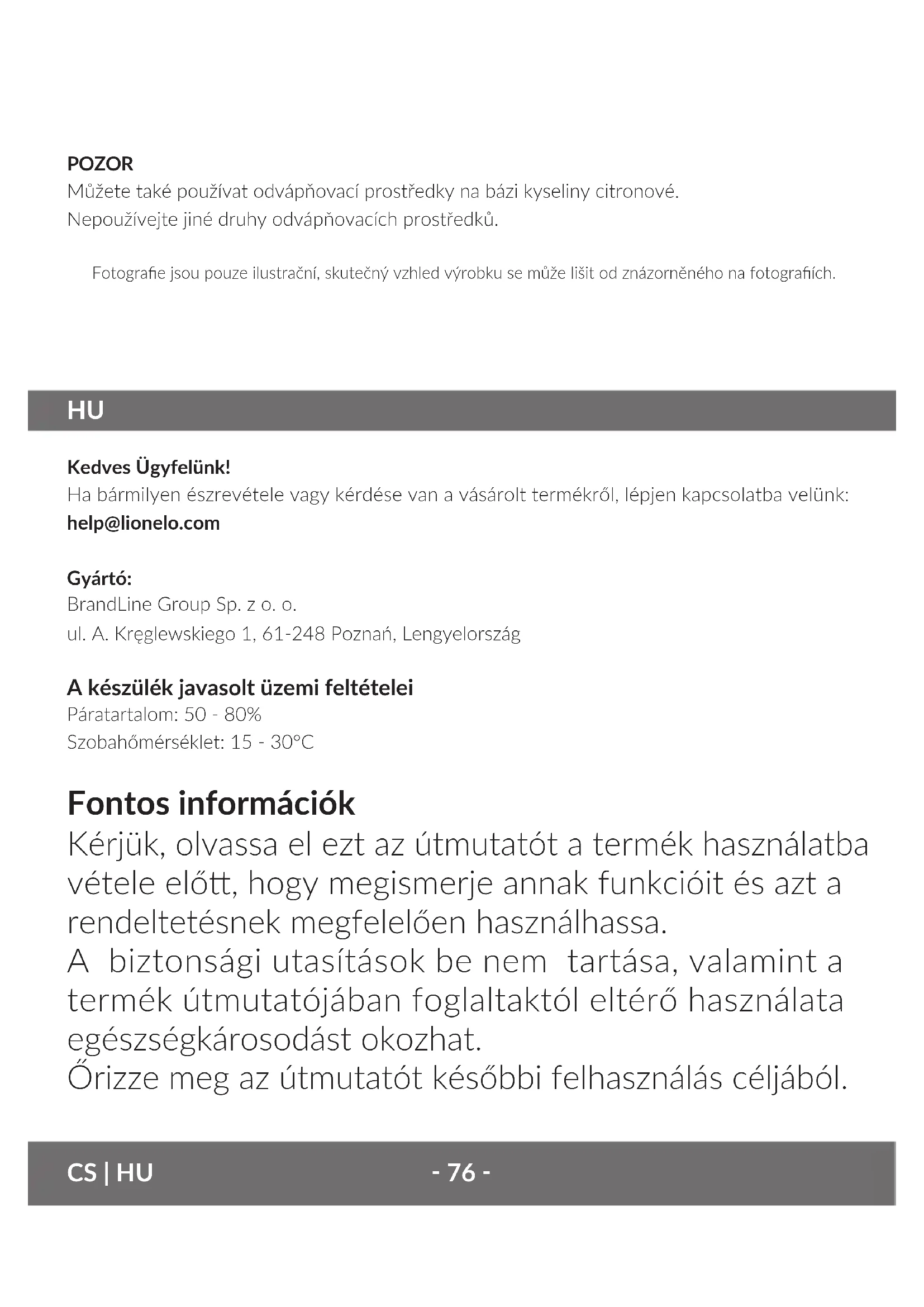 Kedves Ügyfelünk! Ha bármilyen észrevétele vagy kérdése van a vásárolt termékről, lépjen kapcsolatba velünk: help@lionelo.com Gyártó: BrandLine Group Sp. z o. o. ul. A. Kręglewskiego 1, 61-248 Poznań, Lengyelország A készülék javasolt üzemi feltételei Páratartalom: 50 - 80% Szobahőmérséklet: 15 - 30°C Fontos információk Kérjük, olvassa el ezt az útmutatót a termék használatba vétele elő, hogy megismerje annak funkcióit és azt a rendeltetésnek megfelelően használhassa. A biztonsági utasítások be nem tartása, valamint a termék útmutatójában foglaltaktól eltérő használata egészségkárosodást okozhat. Őrizze meg az útmutatót későbbi felhasználás céljából. CS | HU POZOR Můžete také používat odvápňovací prostředky na bázi kyseliny citronové. Nepoužívejte jiné druhy odvápňovacích prostředků. Fotograe jsou pouze ilustrační, skutečný vzhled výrobku se může lišit od znázorněného na fotograích.‑ 77 ‑ HU