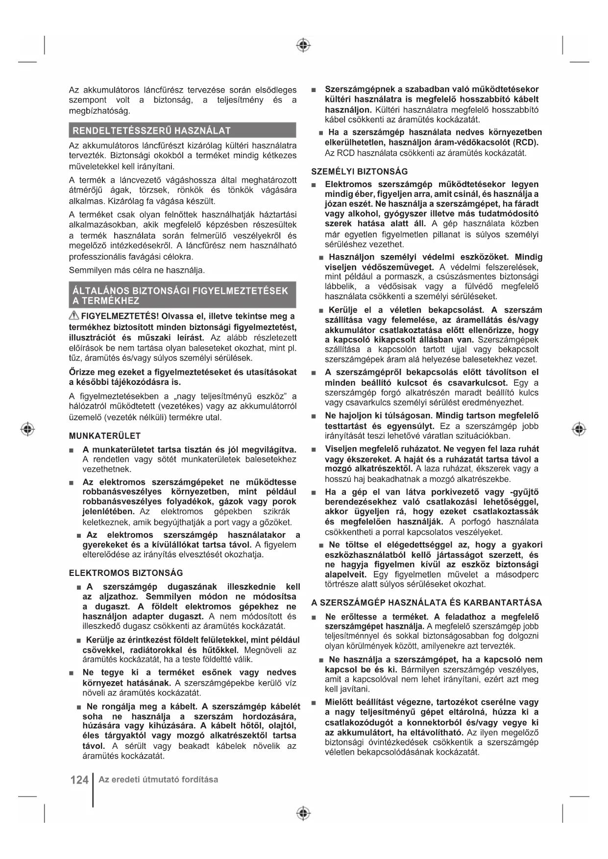■ Tartsa távol a testrészeit a fűrészlánctól a láncfűrész működése közben. A láncfűrész beindítása előtt ellenőrizze, hogy a fűrészlánc nem érintkezik semmivel. Egy figyelmetlen pillanat a láncfűrész használata közben a ruházata vagy a teste fűrészláncba való beakadását okozhatja. ■ A láncfűrészt mindig jobb kézzel a hátsó fogantyút, bal kézzel pedig az elülső fogantyút fogva tartsa. A láncfűrész fordított kéz-konfigurációban való tartása növeli a személyi sérülés kockázatát, így használata tilos. ■ A láncfűrészt csak a szigetelt fogófelületnél tartsa, mert a fűrészlánc rejtett vezetékekhez vagy a saját vezetékéhez is hozzáérhet. Ha a fűrészlánc feszültség alatt álló vezetékkel érintkezik, akkor a láncfűrész külvilággal érintkező fémrészei is áram alá kerülhetnek, és megrázhatják a kezelőt. ■ Viseljen védőszemüveget Érdemes fül-, fej-, kéz- , lábszár- és lábfejvédő felszerelést használni. A megfelelő védőeszközök használata csökkenti a szálló por vagy a fűrészlánccal való véletlen érintkezés miatti sérülés kockázatát. ■ Ne működtesse a láncfűrészt fán, létrán, háztetőn vagy bármilyen instabil felületen. A láncfűrész ilyen használata esetén súlyos személyi sérülés történhet. ■ Mindig megfelelően támassza meg magát, és csak rögzített, szilárd és sima felületen állva használja a láncfűrészt. A csúszos vagy instabil felületek egyensúlyvesztést okozhatnak, illetve a kezelő elvesztheti az irányítást a szerszám felett. ■ Feszülő ág vágásakor figyeljen a visszarugózásra. Ha a fa feszülő rostjai felszabadulnak, a visszarugózó ág eltalálhatja a kezelőt és/vagy megdobhatja a láncfűrészt. ■ Különleges figyelemmel járjon el a kisebb bozót és facsemeték vágásakor. A kisméretű darabok beakadhatnak a fűrészláncba és kivetődhetnek a kezelő felé, vagy kilendíthetik az egyensúlyából. ■ A láncfűrészt kikapcsolt állapotban és a testétől távol tartva, az elülső fogantyúnál fogva szállítsa. A láncfűrész szállításakor vagy tároláskor mindig helyezze fel a láncvezető védőburkolatát. A láncfűrész megfelelő kezelése csökkenti a mozgó fűrészlánccal való véletlen érintkezés kockázatát. ■ Tartsa be a rúd és a lánc kenésére és cseréjére, valamint a lánc megfeszítésére vonatkozó utasításokat. A hibásan megfeszített vagy megkent lánc elszakadhat, és növeli a visszarúgás esélyét is. ■ Csak fát vágjon. Ne használja másra a láncfűrészt, mint amire szánták. Például: ne használja a láncfűrészt fém, műanyag, falazat vagy nem fából készült építőanyag vágására. A láncfűrész rendeltetéstől eltérő műveletekre való használata veszélyes helyzeteket eredményezhet. ■ Ne próbálja meg kivágni a fát, amíg nincs tisztában a felmerülő kockázatokkal és azok elkerülési módjával. Fa kivágása esetén a kezelő vagy a körülötte állók súlyosan megsérülhetnek. ■ Kövessen minden utasítást beragadt anyag kitisztításakor, a láncfűrész tárolásakor vagy javításakor. Győződjön meg róla, hogy a kapcsoló „ki” helyzetben van, és126 Az eredeti útmutató fordítása az akkumulátorcsomag nincs bent. Súlyos személyi sérülést okozhat, ha javítás vagy a beragadt anyag kitisztítása közben a láncfűrész váratlanul elindul. A VISSZARÚGÁS OKAI ÉS A KEZELŐ MEGÓVÁSA: A szerszám megugorhat, ha a működő gép orr-része valamihez hozzáér, vagy ha a vágás során a láncvezető becsípődik a fába és megszorul. A hegy érintkezése a munkadarabbal bizonyos esetekben egy hirtelen visszaható reakciót okozhat, ami a láncvezetőt felfelé és a kezelő irányába dobja. A fűrészlánc beszorulása a láncvezető felső részénél a láncvezetőt hirtelen a kezelő felé dobhatja. Minden ilyen esetben elveszítheti uralmát a láncfűrész felett, és súlyosan megsérülhet. A biztonság tekintetében ne bízzon kizárólag a láncfűrész védőelemeiben. Különböző óvintézkedéseket is kell tenni annak érdekében, hogy csökkentse a balesetek és sérülések veszélyét. A visszarúgás a láncfűrész hibás használatának, és/vagy helytelen működtetési eljárásainak vagy körülményeinek következménye, mely elkerülhető az alább megadott megfelelő óvintézkedések betartásával: ■ Erős fogást tartson, a hüvelykujja és az ujjai öleljék körbe a láncfűrész fogantyúit, mindkét keze a fűrészen legyen, és úgy helyezze a testét és a karjait, hogy lehetővé tegyék a visszarúgás erejének kivédését. A visszarúgási erőket a kezelő kontrollálhatja, ha betartja a megfelelő óvintézkedéseket. Ne hagyja, hogy a láncfűrész elszabaduljon. ■ Ne hajoljon ki túlságosan, és ne vágjon vállmagaság felett. Ezek segítenek megelőzni a hegy véletlen érintkezését és váratlan szituációkban a láncfűrész jobb irányíthatóságát teszik lehetővé. ■ Csak a gyártó által megadott pótvezetősínt és -fűrészláncot használjon. A nem megfelelő pótvezetősín és -fűrészlánc láncszakadást és/vagy visszarúgást okozhat. ■ Tartsa be a gyártó utasításait a lánc élezését és karbantartását illetően. A mélységbeállító magasságának csökkentése a visszarúgás veszélyének megnövekedését okozhatja.