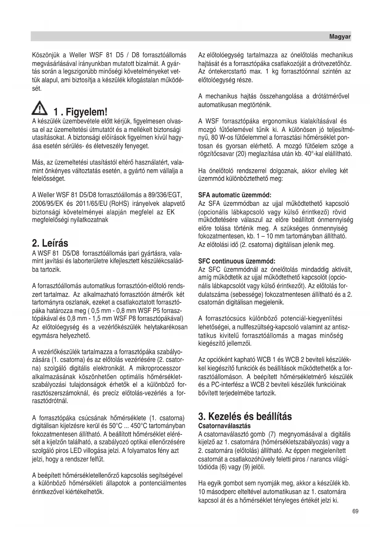 Köszönjük a Weller WSF 81 D5 / D8 forrasztóállomás megvásárlásával irányunkban mutatott bizalmát. A gyár- tás során a legszigorúbb minŒségi követelményeket vet- tük alapul, ami biztosítja a készülék kifogástalan mıködé- sét. 1 . Figyelem! A készülék üzembevétele elŒtt kérjük, figyelmesen olvas- sa el az üzemeltetési útmutatót és a mellékelt biztonsági utasításokat. A biztonsági elŒírások figyelmen kívül hagy- ása esetén sérülés- és életveszély fenyeget. Más, az üzemeltetési utasítástól eltérŒ használatért, vala- mint önkényes változtatás esetén, a gyártó nem vállalja a felelŒsséget. A Weller WSF 81 D5/D8 forrasztóállomás a 89/336/EGT, 2006/95/EK és 2011/65/EU (RoHS) irányelvek alapvetŒ biztonsági követelményei alapján megfelel az EK megfelelŒségi nyilatkozatnak