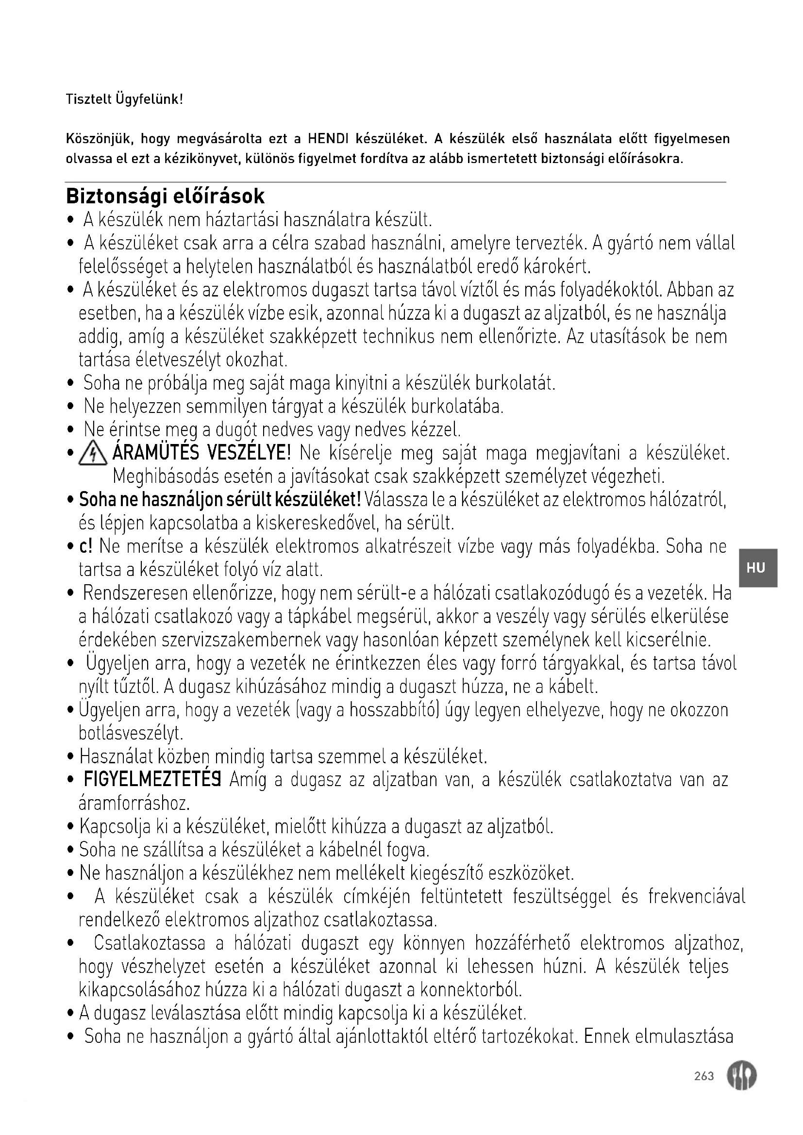 Tisztelt Ügyfelünk! Köszönjük, hogy megvásárolta ezt a HENDI készüléket. A készülék első használata előtt figyelmesen olvassa el ezt a kézikönyvet, különös figyelmet fordítva az alább ismertetett biztonsági előírásokra. Biztonsági előírások