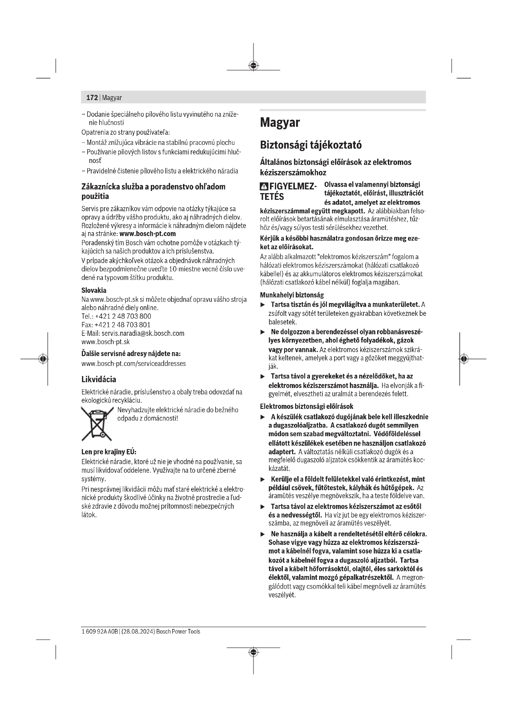 – Dajte elektrické náradie do prepravnej polohy. – Otočte rezací stôl (22) až po zárez (28) pre uhol 0°. Páč- ka (26) musí počuteľne zaskočiť do zárezu. Kontrola (pozri obrázok N1) – Nastavte uhlomer na 90° apoložte ho na rezací stôl (22). Rameno uhlomera musí lícovať (byť vjednej línii) spílovým listom (39) po celej dĺžke. Nastavenie (pozri obrázokN2) – Povoľte aretačnú rukoväť(10). – Uvoľnite poistnú maticu dorazovej skrutky (33) pomocou bežného prstencového alebo vidlicového kľúča (10mm). – Dorazovú skrutku vyskrutkujte tak, aby rameno uhlomera po celej dĺžke lícovalo spílovým listom. – Opäť dotiahnite upínaciu rukoväť (10). – Potom poistnú maticu dorazovej skrutky (33) znova dotiahnite. Ak sa ukazovateľ uhla (32) nenachádza po nastavení vjednej línii so značkou 0° na stupnici (31), pomocou bežného krížo- vého skrutkovača povoľte skrutku (44) anastavte ukazova- teľ uhla pozdĺž značky 0°. Nastavenie štandardného vertikálneho uhla zošikmenia 45° – Dajte elektrické náradie do pracovnej polohy. – Otočte rezací stôl (22) až po zárez (28) pre uhol 0°. Páč- ka (26) musí počuteľne zaskočiť do zárezu. – Uvoľnite aretačnú rukoväť (10) arameno nástroja otočte za rukoväť (16) až na doraz doľava (45°). Kontrola (pozri obrázokO1) – Nastavte uhlomer na uhol 45° apoložte ho na rezací stôl (22). Rameno uhlomera musí lícovať (byť vjednej línii) spílovým listom (39) po celej dĺžke. Nastavenie (pozri obrázokO2) – Uvoľnite aretačnú rukoväť (10). – Uvoľnite poistnú maticu dorazovej skrutky (9) pomocou bežného očkového alebo vidlicového kľúča (10mm). – Dorazovú skrutku vyskrutkujte tak, aby rameno uhlomera po celej dĺžke lícovalo spílovým listom. – Opäť dotiahnite upínaciu rukoväť (10). – Potom poistnú maticu dorazovej skrutky (9) znova dotiahnite. Ak ukazovateľ uhla (32) po nastavení nie je vjednej línii so značkou 45° na stupnici (31), prekontrolujte znova najprv nastavenie hodnoty 0° pre vertikálny uhol zošikmenia auka- zovatele uhla. Potom zopakujte nastavenie vertikálneho uhla zošikmenia 45°. Vyrovnanie (horizontálne) ukazovateľa uhla (pozri obrázokP) – Dajte elektrické náradie do pracovnej polohy. – Otočte rezací stôl (22) až po zárez (28) pre uhol 0°. Páč- ka (26) musí počuteľne zaskočiť do zárezu. Kontrola Ukazovateľ uhla (24) musí byť vjednej línii so značkou 0° mm na stupnici (5). Nastavenie – Uvoľnite skrutku (45) dodaným krížovým skrutkovačom avyrovnajte ukazovateľ uhla pozdĺž značky 0°. – Skrutku opäť utiahnite. Preprava (pozri obrázokQ) Predtým, ako budete elektrické náradie prepravovať, musíte vykonať nasledujúce kroky: – Povoľte aretačnú skrutku (11), ak je utiahnutá. Potiahnite rameno nástroja celkom smerom dopredu aaretačnú skrutku opäť utiahnite. – Dajte elektrické náradie do prepravnej polohy. – Odstráňte všetko príslušenstvo, ktoré nemôže byť na elektrickom náradí pevne namontované. Nepoužívané pílové listy majte pri preprave podľa mož- nosti uložené vnejakom uzavretom obale. – Pri dvíhaní alebo prenášaní náradia siahnite do priehlbín na prenášanie (4) po bokoch rezacieho stola (22). u Pri preprave tohto elektrického náradia používajte len transportné prvky náradia, nikdy však nepoužívajte bezpečnostné prvky náradia. Údržba aservis Údržba ačistenie u Pred všetkými prácami na elektrickom náradí vytiah- nite sieťovú zástrčku zo zásuvky. u Elektrické náradie a vetracie štrbiny udržiavajte v čis- tote, aby ste mohli dobre a bezpečne pracovať. Ak je potrebná výmena pripájacieho vedenia, musí ju vy- konať Bosch alebo niektoré autorizované stredisko služieb zákazníkom pre elektrické náradie Bosch, aby sa zabránilo ohrozeniam bezpečnosti. Výkyvný ochranný kryt (19) musí byť vždy voľne pohyblivý a musí sa sám zatvárať. Okolie výkyvného ochranného krytu preto udržiavajte vždy včistote. Po každej práci odstráňte prach atriesky vyfúkaním tlakovým vzduchom alebo odstránením pomocou štetca. Pravidelne čistite klzný valček(20). Opatrenia na zníženie hlučnosti Opatrenia zo strany výrobcu: – Pozvoľný rozbeh Bosch Power Tools 1 609 92A A0B | (28.08.2024)172 | Magyar – Dodanie špeciálneho pílového listu vyvinutého na zníže- nie hlučnosti Opatrenia zo strany používateľa: – Montáž znižujúca vibrácie na stabilnú pracovnú plochu – Používanie pílových listov sfunkciami redukujúcimi hluč- nosť – Pravidelné čistenie pílového listu aelektrického náradia Zákaznícka služba aporadenstvo ohľadom použitia Servis pre zákazníkov vám odpovie na otázky týkajúce sa opravy a údržby vášho produktu, ako aj náhradných dielov. Rozložené výkresy a informácie k náhradným dielom nájdete aj na stránke: www.bosch-pt.com Poradenský tím Bosch vám ochotne pomôže votázkach tý- kajúcich sa našich produktov aich príslušenstva. Vprípade akýchkoľvek otázok aobjednávok náhradných dielov bezpodmienečne uveďte 10‑miestne vecné číslo uve- dené na typovom štítku produktu. Slovakia Na www.bosch-pt.sk si môžete objednať opravu vášho stroja alebo náhradné diely online. Tel.: +421 2 48 703 800 Fax: +421 2 48 703 801 E-Mail: servis.naradia@sk.bosch.com www.bosch-pt.sk Ďalšie servisné adresy nájdete na: www.bosch-pt.com/serviceaddresses Likvidácia Elektrické náradie, príslušenstvo aobaly treba odovzdať na ekologickú recykláciu. Nevyhadzujte elektrické náradie do bežného odpadu zdomácnosti! Len pre krajinyEÚ: Elektrické náradie, ktoré už nie je vhodné na používanie, sa musí likvidovať oddelene. Využívajte na to určené zberné systémy. Pri nesprávnej likvidácii môžu mať staré elektrické aelektro- nické produkty škodlivé účinky na živo
