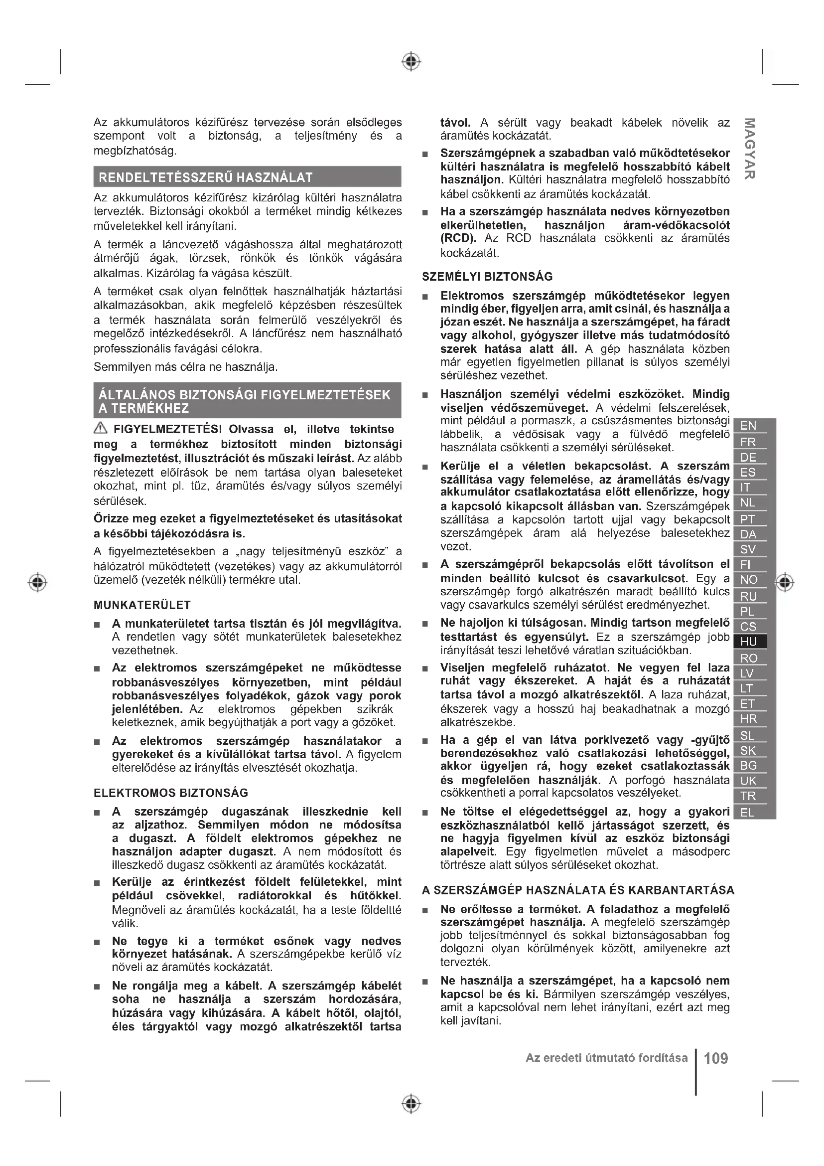 ■ Vegyen részt professzionálisan szervezett tanfolyamon a kézifűrészek használatáról és karbantartásáról, a megelőző lépésekről és az elsősegélyről. Tartsa meg a kézikönyvet, hátha a későbbiekben szüksége lehet rá. ■ A kézifűrészek potenciálisan veszélyes eszközök. A kézifűrész használatával járó balesetek gyakran a végtagok elvesztésével vagy halállal végződnek. A leeső ágak, kidőlő fák, guruló rönkök is ölhetnek. A beteg vagy rothadó tönkök további veszélyt jelentenek. Minden erejével a feladat biztonságos befejezésére kell összpontosítania. Bármilyen kétség esetén hagyja a munkát egy profi favágóra. ■ Ne vágjon szőlőtőkét és/vagy kisméretű bozótot (30 mm-nél kisebb átmérőjűt). ■ A termék első kezelésekor ajánlott rönkök vágását fűrészbakon vagy állványon gyakorolni. ■ A munkaterület mérete függ a végrehajtandó munkától, és a fa méretétől, vagy a munkadarab nagyságától. A kezelőnek ébernek kell lennie, és oda kell figyelnie mindenre a munkaterületen. ■ Ne tegyen előre-hátra fűrészelő mozdulatokat. Hagyja, hogy a lánc végezze a munkát. A láncot tartsa éles állapotban és ne próbálja meg a vágáson áttolni azt. ■ Ne fejtsen ki nyomóerőt a láncfűrészre a vágás végén. Legyen készen, hogy átvegye a fűrész súlyát, amint az kiszabadul a vágásból. Ha nem így tesz, súlyos személyi sérülés lehet az eredmény. ■ Ne állítsa le a fűrészt a vágási művelet közepén. Addig működtesse a fűrészt, amíg ki nem veszi a vágásból. ■ A forgó alkatrészek megérintése miatt keletkező sérülés kockázatának csökkentésére minden esetben állítsa le a terméket, vegye ki az akkumulátort és győződjön meg arról, hogy minden mozgó alkatrész teljesen megállt: ● tisztítás vagy eltömődés megszüntetése előtt ● mielőtt magára hagyná a terméket ● mielőtt felszerelné vagy eltávolítaná a tartozékokat ● ellenőrzés, karbantartás vagy a gépen végzett bármilyen művelet megkezdése előtt ■ Hosszabb használat sérülést okozhat. Ha a terméket hosszabb ideig használja, ügyeljen arra, hogy rendszeresen tartson szünetet. ■ Ha a gép leesett, erős ütést kapott vagy rendellenesen kezd vibrálni, azonnal állítsa le a gépet, és vizsgálja át sérülések tekintetében vagy azonosítsa a vibráció okát. Minden sérülést hivatalos szervizközpontban kell megjavíttatni vagy kicseréltetni. ■ Csak 0 °C és 40 °C közötti hőmérsékleten használja a készüléket. ■ A készüléket -10 °C és 50 °C közötti hőmérsékleten tárolja. SZEMÉLYI VÉDELMI ESZKÖZÖK A szakemberek által is használt, jó minőségű személyi védőfelszerelés, segít csökkenteni az üzemeltető sérülésének kockázatát. A termék működtetésekor használja a következő cikkeket: ■ Védősisak – meg kell felelnie az EN 397 szabványnak, és CE jelöléssel kell rendelkeznie ■ Fülvédő – meg kell felelnie az EN 352-1 szabványnak, és CE jelöléssel kell rendelkeznie ■ Szem- és arcvédő – CE jelöléssel kell rendelkeznie és meg kell felelnie az EN 166 (a védőszemüvegek esetében) vagy az EN 1731 (hálós arcvédő esetében) szabványnak112 Az eredeti útmutató fordítása ■ Kesztyűk – meg kell felelnie az EN ISO 11393-4 szabványnak, és CE jelöléssel kell rendelkeznie ■ Lábvédelem (vágásálló) – meg kell felelnie az EN ISO 11393-2 szabványnak és CE jelöléssel kell rendelkeznie, és teljes körű védelmet kell nyújtania. ■ A kézifűrészhez használt biztonsági lábbelinek – meg kell felelnie az EN ISO 20345:2004 szabványnak, és az EN ISO 11393-3 szabványnak való megfelelés érdekében egy kézifűrészt ábrázoló pajzzsal kell jelölni. (Az alkalmi felhasználók használhatnak acél orrmerevítővel ellátott biztonsági lábbelit is lábszárvédőkkel, ami megfelel az EN ISO 11393-5 szabványnak, ha a talaj egyenletes és kicsi az aljnövényzetbe való felbukás vagy beakadás esélye) ■ Védőkabát a kézifűrészhez a felsőtest védelme érdekében – meg kell felelnie az EN ISO 11393-6 szabványnak, és CE jelöléssel kell rendelkeznie AZ AKKUMULÁTOR KIEGÉSZÍTŐ BIZTONSÁGI FIGYELMEZTETÉSEI ■ A rövidzárlat általi tűz, sérülések vagy termékkárosodások veszélye elkerülésére ne merítse a szerszámot, a cserélhető akkut vagy a töltőkészüléket folyadékokba, és gondoskodjon arról, hogy ne hatoljanak folyadékok a készülékekbe és az akkukba. A korrozív hatású vagy vezetőképes folyadékok, mint pl. a sós víz, bizonyos vegyi anyagok, fehérítők vagy fehérítő tartalmú termékek, rövidzárlatot okozhatnak. ■ Olyan helyen töltse az akkumulátort, ahol a környezeti hőmérséklet 10 °C és 38 °C között van. ■ Az akkumulátort 0 °C és 20°C közötti hőmérsékleten tárolja. AZ ALAPVETŐ FAKIVÁGÁSI ÉS KERESZTVÁGÁSI
