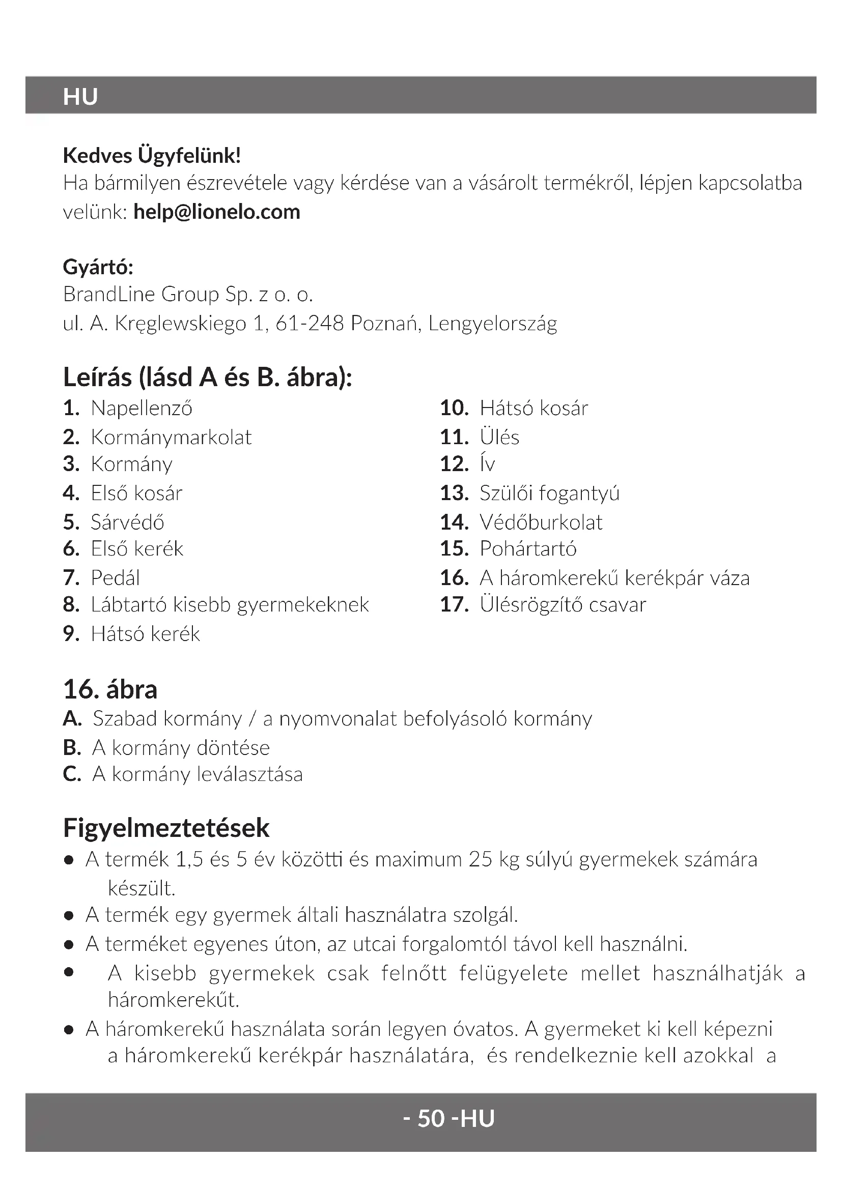 Kedves Ügyfelünk! Ha bármilyen észrevétele vagy kérdése van a vásárolt termékről, lépjen kapcsolatba velünk: help@lionelo.com Gyártó: BrandLine Group Sp. z o. o. ul. A. Kręglewskiego 1, 61-248 Poznań, Lengyelország Leírás (lásd A és B. ábra):