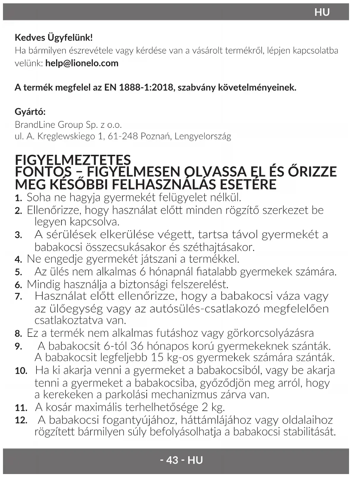 Fotograe slouží pouze pro ilustraci, skutečný vzhled výrobků se může lišit od vzhledu uvedeného na fotograích.‑ 43 ‑ HU Kedves Ügyfelünk! Ha bármilyen észrevétele vagy kérdése van a vásárolt termékről, lépjen kapcsolatba velünk: help@lionelo.com A termék megfelel az EN 1888-1:2018, szabvány követelményeinek. Gyártó: BrandLine Group Sp. z o.o. ul. A. Kręglewskiego 1, 61-248 Poznań, Lengyelország FIGYELMEZTETES