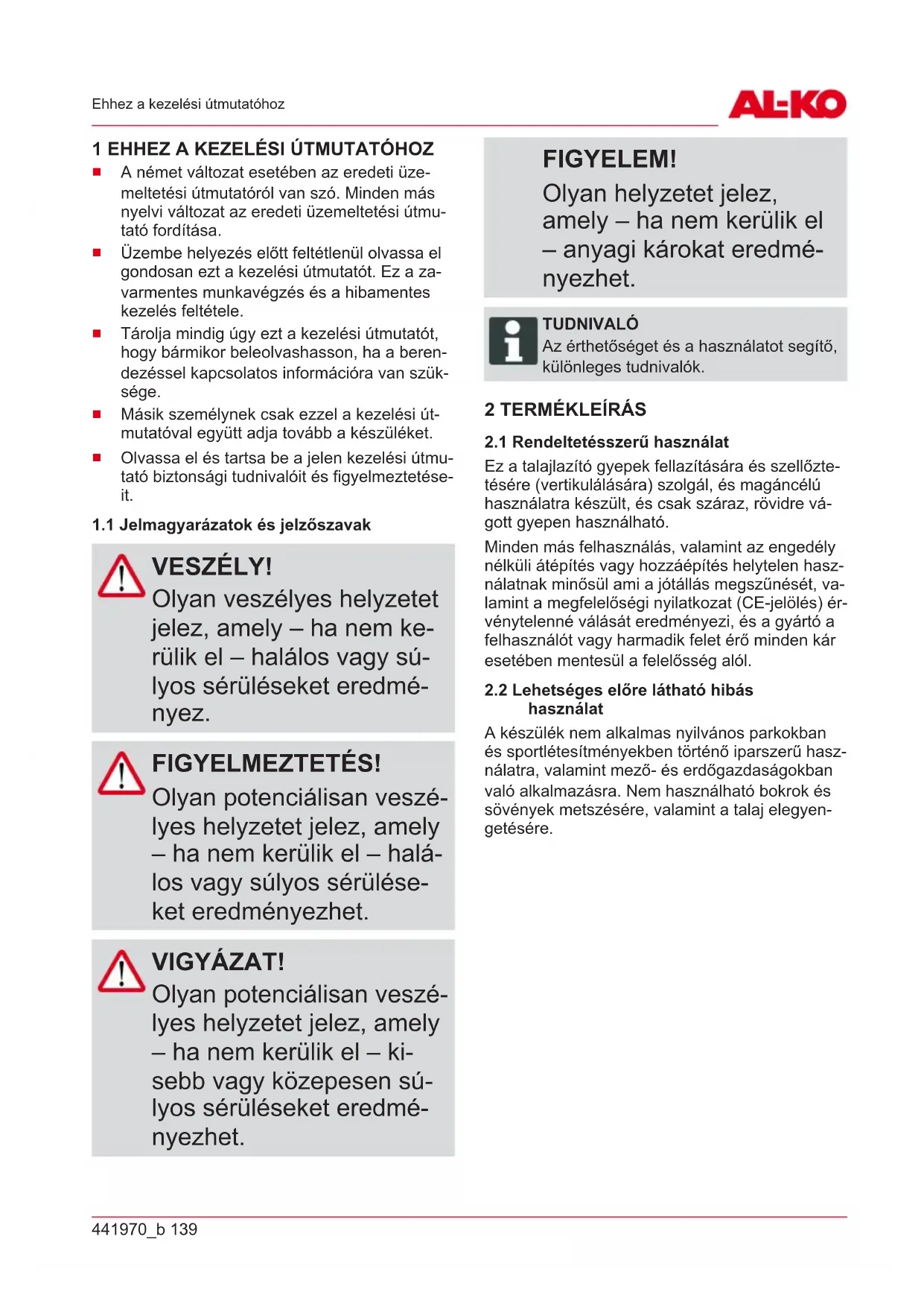 Ez a talajlazító gyepek fellazítására és szellőzte- tésére (vertikulálására) szolgál, és magáncélú használatra készült, és csak száraz, rövidre vá- gott gyepen használható. Minden más felhasználás, valamint az engedély nélküli átépítés vagy hozzáépítés helytelen hasz- nálatnak minősül ami a jótállás megszűnését, va- lamint a megfelelőségi nyilatkozat (CE-jelölés) ér- vénytelenné válását eredményezi, és a gyártó a felhasználót vagy harmadik felet érő minden kár esetében mentesül a felelősség alól.