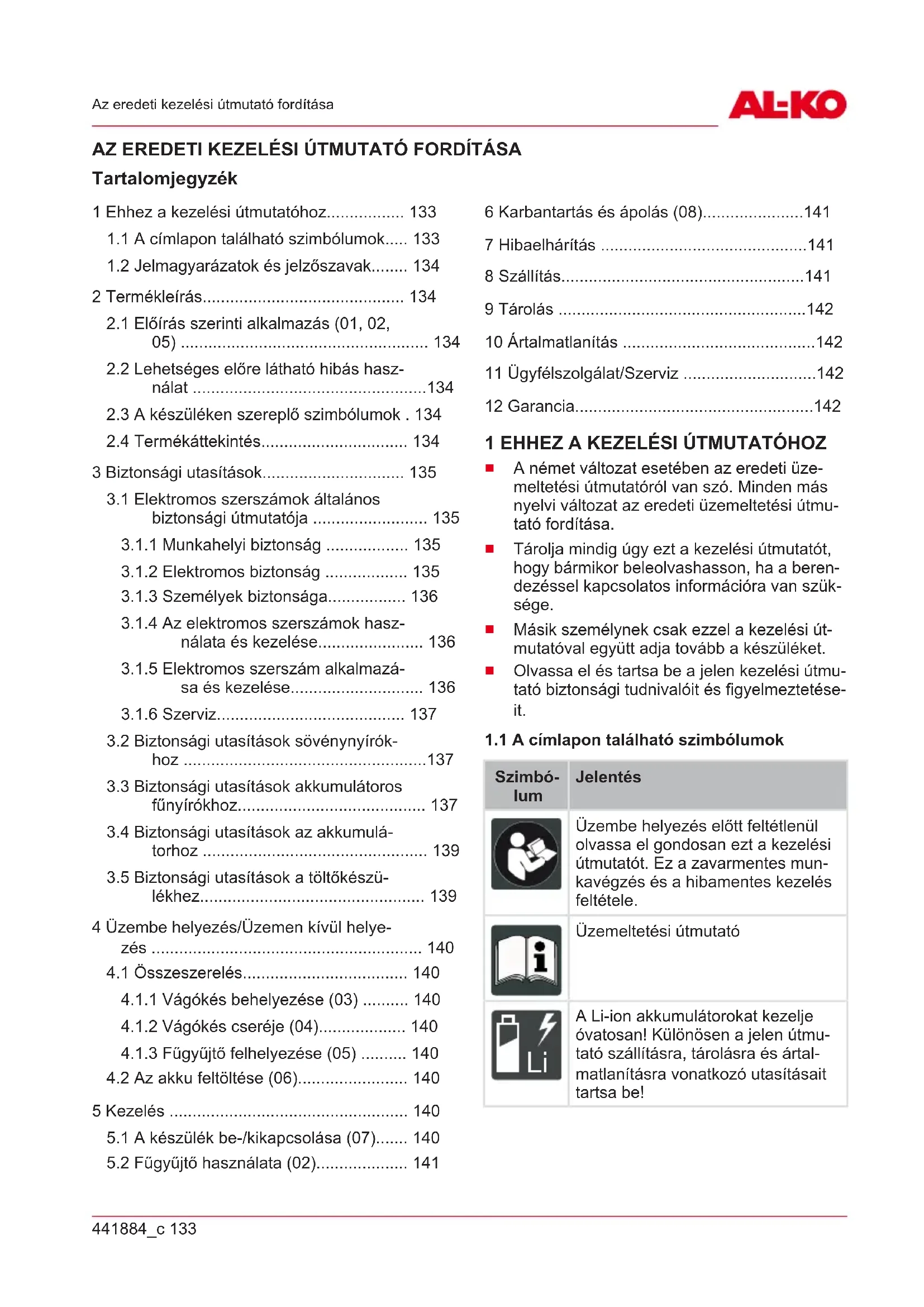 A garanciával, javítással vagy pótalkatrészekkel kapcsolatos kérdések esetén kérjük, forduljon a legközelebbi AL-KOszervizhez. Ezeket megtalál- ja az interneten a következő oldalon: www.al-ko.com/service-contacts 12 GARANCIA A berendezés esetleges anyag- és gyártási hibáinak elhárítása javítással vagy alkatrészcserével törté- nik a törvényben előírt jótállási időn belül. A jótállási határidőt azon ország jogrendszere határozza meg, ahol a berendezést vásárolták. A garancia kizárólag akkor érvényes, ha: