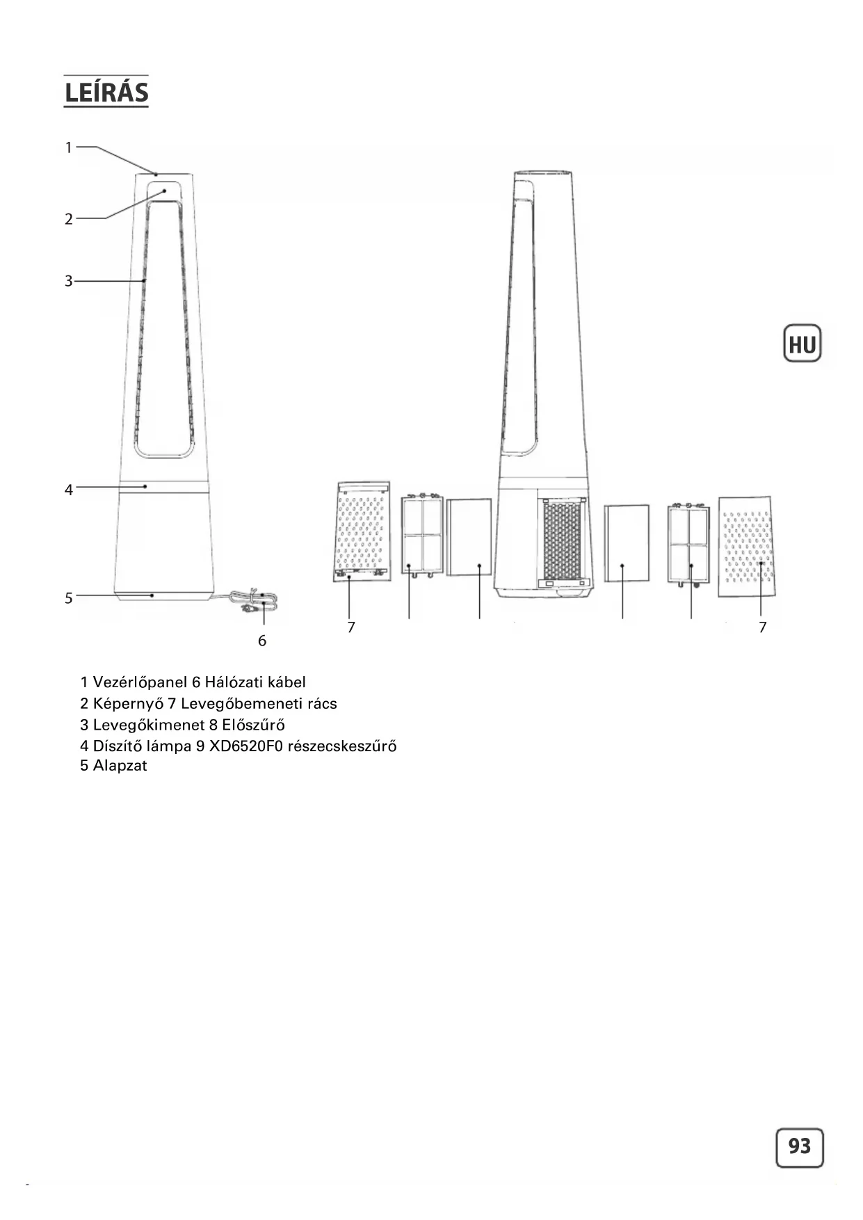 1 Vezérlőpanel 6 Hálózati kábel 2 Képernyő 7 Levegőbemeneti rács 3 Levegőkimenet 8 Előszűrő 4 Díszítő lámpa 9 XD6520F0 részecskeszűrő 5 Alapzat