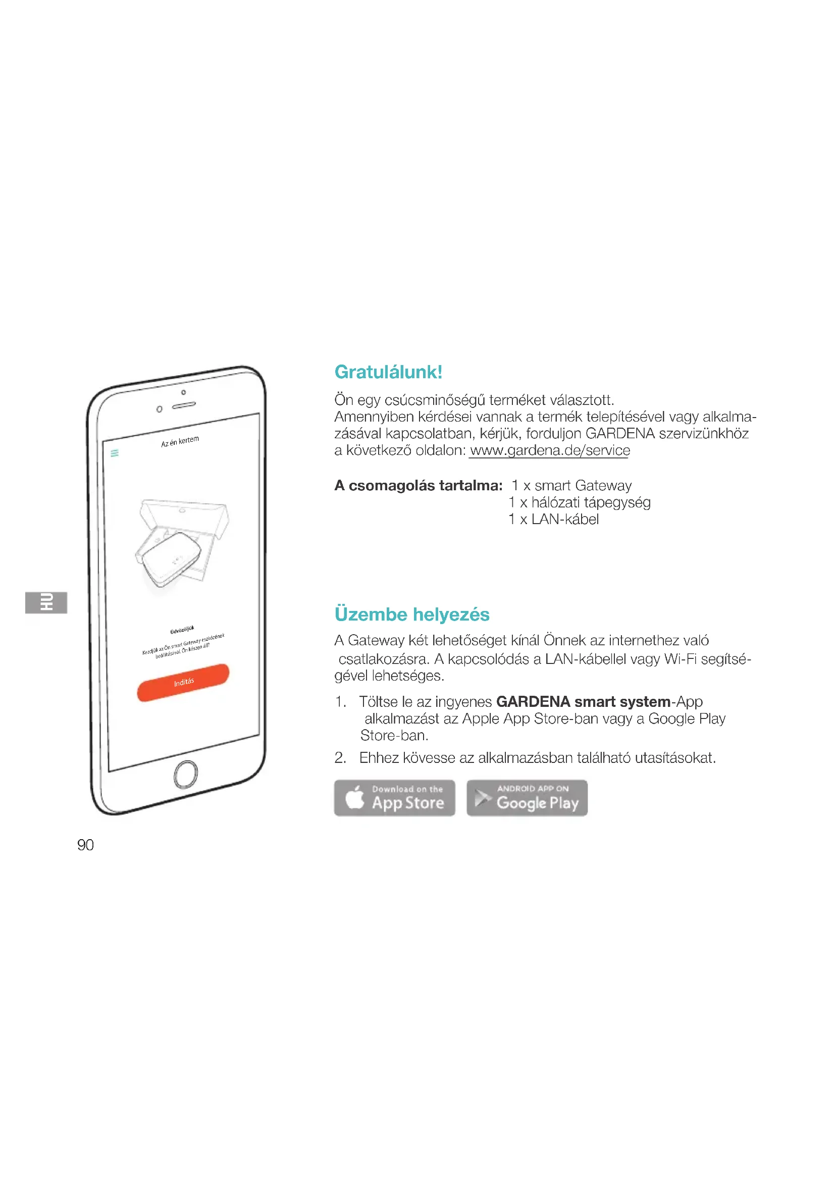 Gratulálunk! Ön egy csúcsminőségű terméket választott. Amennyiben kérdései vannak a termék telepítésével vagy alkalma- zásával kapcsolatban, kérjük, forduljon GARDENA szervizünkhöz a következő oldalon: www.gardena.de/service A csomagolás tartalma: 1 x smart Gateway 1 x hálózati tápegység 1 x LAN-kábel Üzembe helyezés A Gateway két lehetőséget kínál Önnek az internethez való csatlakozásra. A kapcsolódás a LAN-kábellel vagy Wi-Fi segítsé- gével lehetséges.