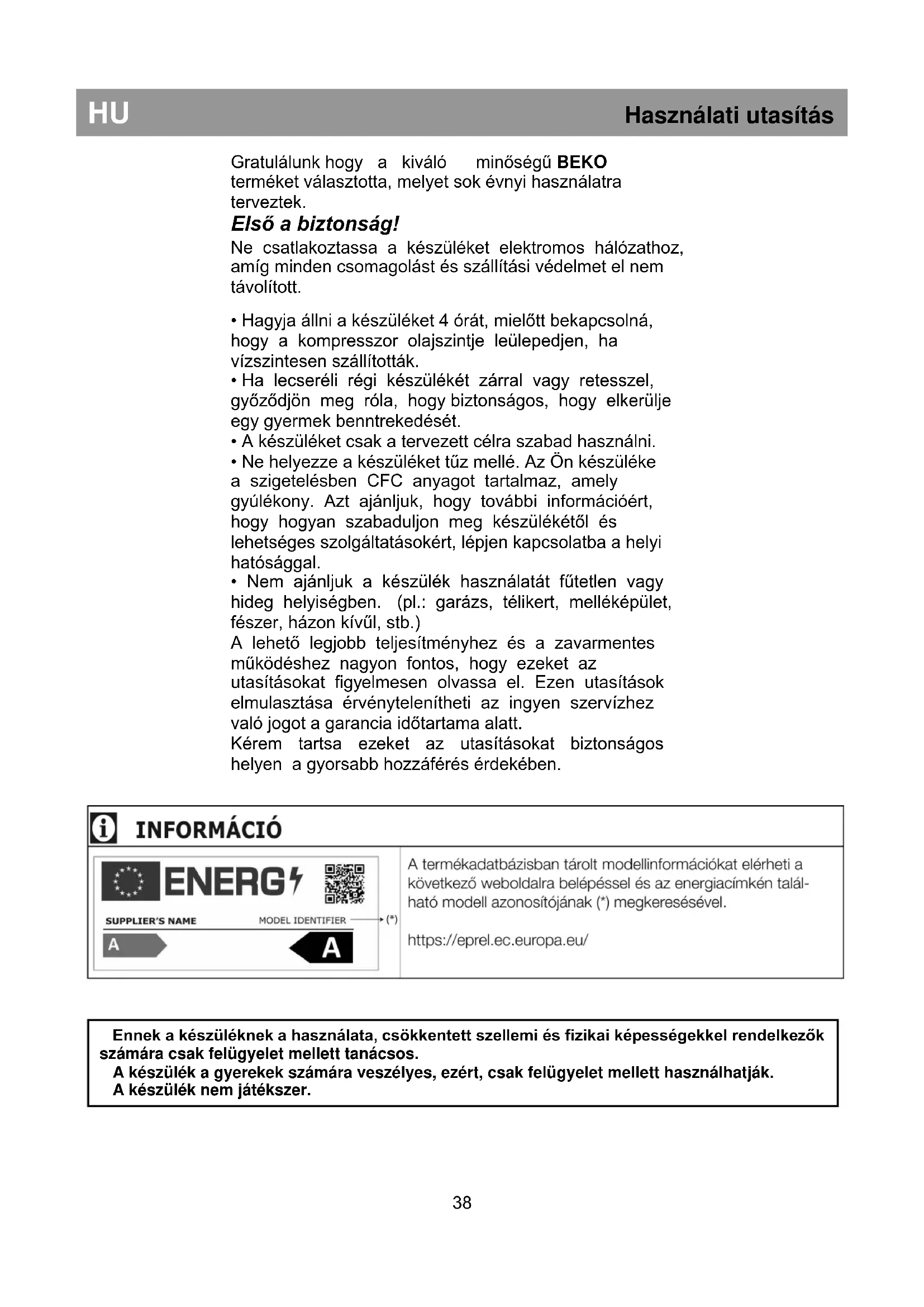 Ennek a készüléknek a használata, csökkentett szellemi és fizikai képességekkel rendelkezők számára csak felügyelet mellett tanácsos. A készülék a gyerekek számára veszélyes, ezért, csak felügyelet mellett használhatják. A készülék nem játékszer. HU Használati utasításHU Használati utasítás Elektromos követelmény Mielőtt bedugná a dugót a konnektorba, győződjön meg róla, hogy a feszültség és a hálózati frekvencia megfelel a készülékben találhtó címkén lévő besorolásnak. Azt ajánljuk, hogy a készülékét egy megfelelő kapcsolón keresztül csatlakoztassa egy könnyen elérhető konnektorba. FIGYELMEZTETÉS! Ezt a készüléket földelni kell. Az elektromos berendezés javítását csak képesített technikus végezheti. Képzetlen személy által végrehajtott javítás kozkázatot rejt, amely kritikus következményekkel járhat a készülék felhasználója számára. Figyelem! Ez a készülék R600a – val működik, amely környezetbarát, de gyúlékony gáz. A termék szállítása és rögzítése folyamán ügyelnie kell arra, hogy ne sértse meg a hűtőrendszert. Ha a hűtőrendszer megsérül és a gáz szivárog a rendszerből, tartsa távol nyílt lángtól és szellőztesse ki a helyiséget rövid időre. Figyelmeztetés! – Ne használjon mechanikus berendezéseket vagy egyéb eszközöket a kiolvasztás felgyorsításához, mint amelyeket a gyártó ajánlott. FIGYELMEZTETÉS – Ne sértse meg a fagyasztó kört. FIGYELMEZTETÉS – Ne használjon elektromos berendezést a készülék élelmiszer tárolására alkalmas rekeszeiben, kivéve a gyártó által ajánlott típusokat. FIGYELMEZTETÉS – Ha az áramellátó zsinór megsérült, annak kicserélését a gyártóval, a gyártó szervizelőjével vagy hasonló képzett szakemberrel kell elvégeztetni a veszély elkerülése érdekében. Szállítási utasítások