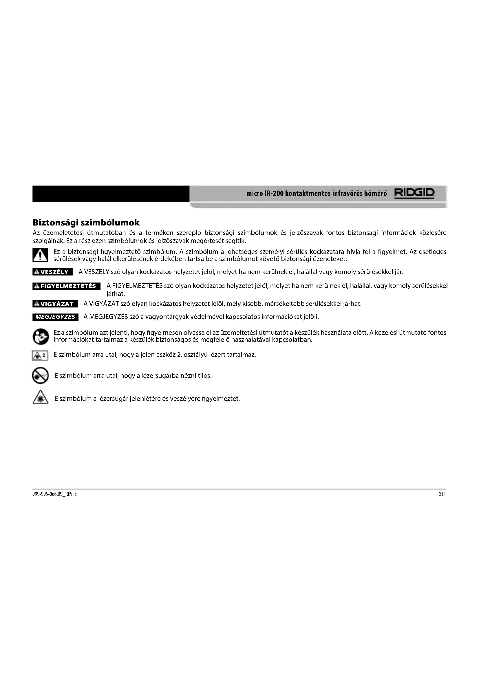 Biztonsági szimbólumok Az üzemeletetési útmutatóban és a terméken szereplő biztonsági szimbólumok és jelzőszavak fontos biztonsági információk közlésére szolgálnak. Ez a rész ezen szimbólumok és jelzőszavak megértését segítik. VESZÉLY Ez a biztonsági gyelmeztető szimbólum. A szimbólum a lehetséges személyi sérülés kockázatára hívja fel a gyelmet. Az esetleges sérülések vagy halál elkerülésének érdekében tartsa be a szimbólumot követő biztonsági üzeneteket. A VESZÉLY szó olyan kockázatos helyzetet jelöl, melyet ha nem kerülnek el, halállal vagy komoly sérülésekkel jár. A FIGYELMEZTETÉS szó olyan kockázatos helyzetet jelöl, melyet ha nem kerülnek el, halállal, vagy komoly sérülésekkel járhat. A VIGYÁZAT szó olyan kockázatos helyzetet jelöl, mely kisebb, mérsékeltebb sérülésekkel járhat. A MEGJEGYZÉS szó a vagyontárgyak védelmével kapcsolatos információkat jelöli. Ez a szimbólum azt jelenti, hogy gyelmesen olvassa el az üzemeltetési útmutatót a készülék használata előtt. A kezelési útmutató fontos információkat tartalmaz a készülék biztonságos és megfelelő használatával kapcsolatban. MEGJEGYZÉS FIGYELMEZTETÉS VIGYÁZAT E szimbólum arra utal, hogy a jelen eszköz 2. osztályú lézert tartalmaz. E szimbólum arra utal, hogy a lézersugárba nézni tilos. E szimbólum a lézersugár jelenlétére és veszélyére gyelmeztet.212 micro IR-200 kontaktmentes infravörös hőmérő