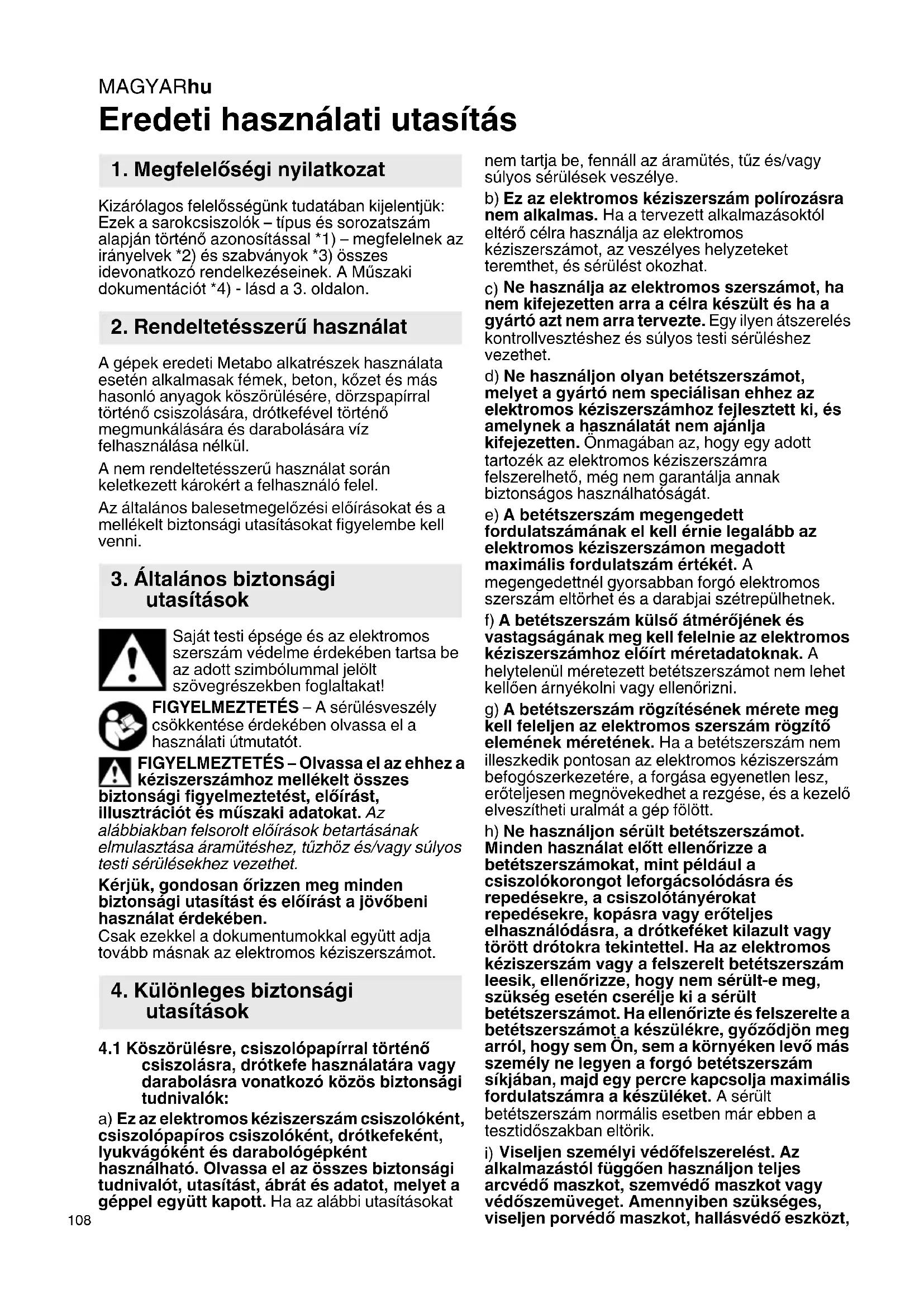 Eredeti használati utasítás Kizárólagos felelősségünk tudatában kijelentjük: Ezek a sarokcsiszolók – típus és sorozatszám alapján történő azonosítással *1) – megfelelnek az irányelvek *2) és szabványok *3) összes idevonatkozó rendelkezéseinek. A Műszaki dokumentációt *4) - lásd a 3. oldalon. A gépek eredeti Metabo alkatrészek használata esetén alkalmasak fémek, beton, kőzet és más hasonló anyagok köszörülésére, dörzspapírral történő csiszolására, drótkefével történő megmunkálására és darabolására víz felhasználása nélkül. A nem rendeltetésszerű használat során keletkezett károkért a felhasználó felel. Az általános balesetmegelőzési előírásokat és a mellékelt biztonsági utasításokat figyelembe kell venni. Saját testi épsége és az elektromos szerszám védelme érdekében tartsa be az adott szimbólummal jelölt szövegrészekben foglaltakat! FIGYELMEZTETÉS – A sérülésveszély csökkentése érdekében olvassa el a használati útmutatót. FIGYELMEZTETÉS – Olvassa el az ehhez a kéziszerszámhoz mellékelt összes biztonsági figyelmeztetést, előírást, illusztrációt és műszaki adatokat. Az alábbiakban felsorolt előírások betartásának elmulasztása áramütéshez, tűzhöz és/vagy súlyos testi sérülésekhez vezethet. Kérjük, gondosan őrizzen meg minden biztonsági utasítást és előírást a jövőbeni használat érdekében. Csak ezekkel a dokumentumokkal együtt adja tovább másnak az elektromos kéziszerszámot.