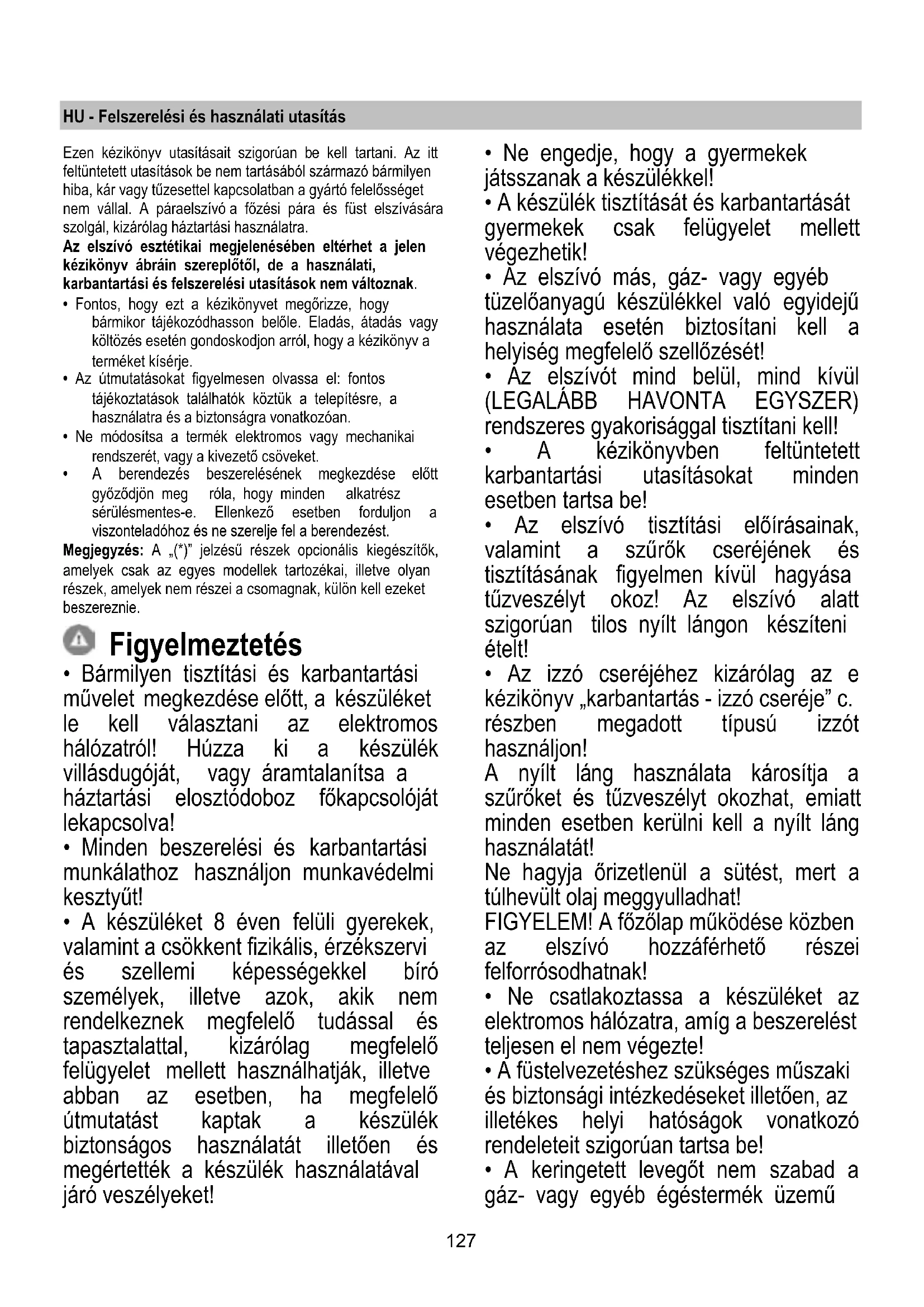 - Az elszívó tisztítási előírásainak, valamint a szűrők cseréjének és tisztításának figyelmen kívül hagyása tűzveszélyt okoz! Az elszívó alatt szigorúan tilos nyílt lángon készíteni ételt!