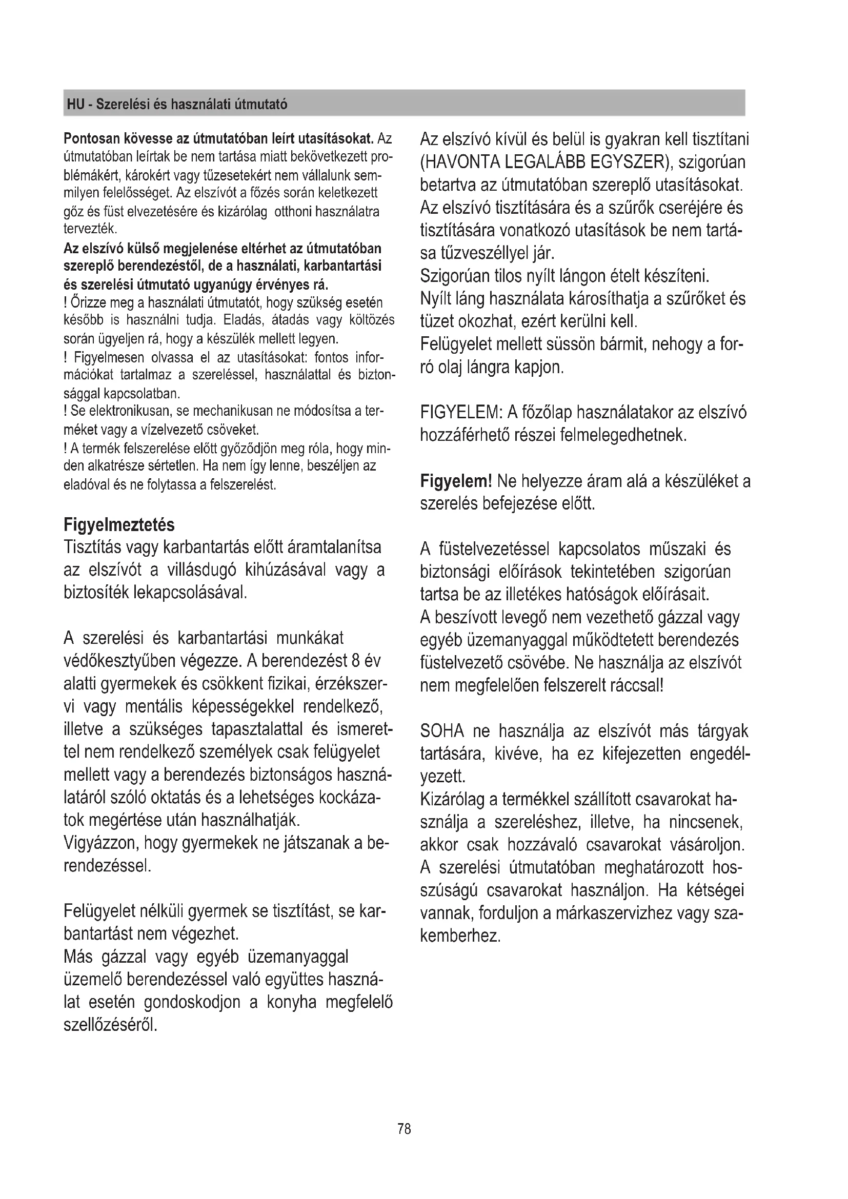 - EMC: EN 55014-1; CISPR 14-1; EN 55014-2; CISPR 14-2; CEI/EN 61000-3-2; CEI/EN 61000-3-3. Hasznos tanácsok a környezeti károsodás csökkentése érdekében: A főzés megkezdésekor a legkisebb fokozatban kapc- solja be az elszívót, a főzés után is hagyja be- kapcsolva néhány percig. Csak nagy füst vagy gőz esetén kapcsolja magasabb fokozatba, a booster funkciót csak kivételes esetben ha- sználja. A szagelszívó rendszer hatékonyságá- nak fenntartásához cserélje ki a szűrőket, amikor az szükségessé válik. A zsírszűrő hatékonyságának fenntartásához tisztítsa ki, amikor az szükségessé válik. A hatékonyság növelése és a zajcsökkentésérdekében az út- mutatóban meghatározott legnagyobb átmérőjű csöveket használja. Felhasználás Az elszívó szabadba kivezetett vagy belső légtérben keringtető szénszűrős változatban használható. Szabadba kivezetett Az összekötőelem karimájára rögzített kimenő csövön át kerül kivezetésre a szabadba. A kimenő cső átmérőjének meg kell egyeznie a csatlakozó gyűrűjével. Figyelem! A kivezetőcső nem tartozék, külön kell beszerezni. A vízszintes részen a cső enyhén lejtsen (kb. 10°), hogy könyebben kive- zesse a levegőt. Az esetleges szénszűrőket ki kell venni.80 Szűrős változat A beszívott levegőt zsírtalanítja, mielőtt vissza- forgatja a helységbe. Ha ebben az üzemmódban használja az elszívót, szükséges beszerelni a szénszűrőket. Megjegyzés: A szénszűrökön átvezetett levegőt egy, a berendezés oldalán található csövön át jut vissza a konyhába. Szerelés Megjegyzés: oly módon kell felszerelni, hogy kar- bantartás esetén bármikor hozzá lehessen férni az elszívóhoz és az elektromos alkatrészekhez. FIGYELMEZTETÉS: Az elektromos alkatrés- zeket tartalmazó fémdoboz ne legyen közelebb, mint 65 cm a gázfőzőlaphoz és 65 cm-re legyen az elszívó beszívójától. JÓ TANÁCS Javasoljuk, hogy az elektromos alkatrészeket tartalmazó fémdoboz legalább 10 cm-re legyen a plafontól és megfelelő távolsá- gra a hőforrásoktól (pl.: sütő oldalától, vagy a főzőlaptól). Ha a gázfőzőlap szerelési útmutatójában nag- yobb távolság szerepel, akkor azt kell gyelembe venni. Elektromos csatlakozás Az elszívó bekötését szakemberrel végeztesse. A hálózati feszültség feleljen meg az elszívó hátoldalán lévő címkén jelzett értéknek. Ha villá- sdugóval ellátott, akkor olyan szabványos dugalj- ba dugja be, ahol szerelés után is hozzáférhető lesz. Ha nincs hozzá villásdugó (közvetlen kapc- solat a hálózatra) vagy a szerelés után nem lenne hozzáférhető a dugalj, akkor kössön rá egy szabványos bifázisú kapcsolót, amely III. kategóriájú túlfeszültség esetén megszünteti az áramellátást és megfelel a szerelési szabályok- nak. Figyelem! Mielőtt újra áram alá helyezné a készüléket, illetve ellenőrízné a megfelelő működést, vizsgálja meg, hogy a betáp megfelelően lett e felszerelve. Szerelés Mielőtt felszerelné a készüléket, győződjön meg arról, hogy minden alkatrész sérülésmen- tes legyen, ellenkező esetben keresse a viszon- teladót és ne fogjon bele a szerelésbe. Gondo- san olvassa el az alábbi utasításokat. Legfeljebb 5 m hosszú elszívó csövet ha- sználjon.