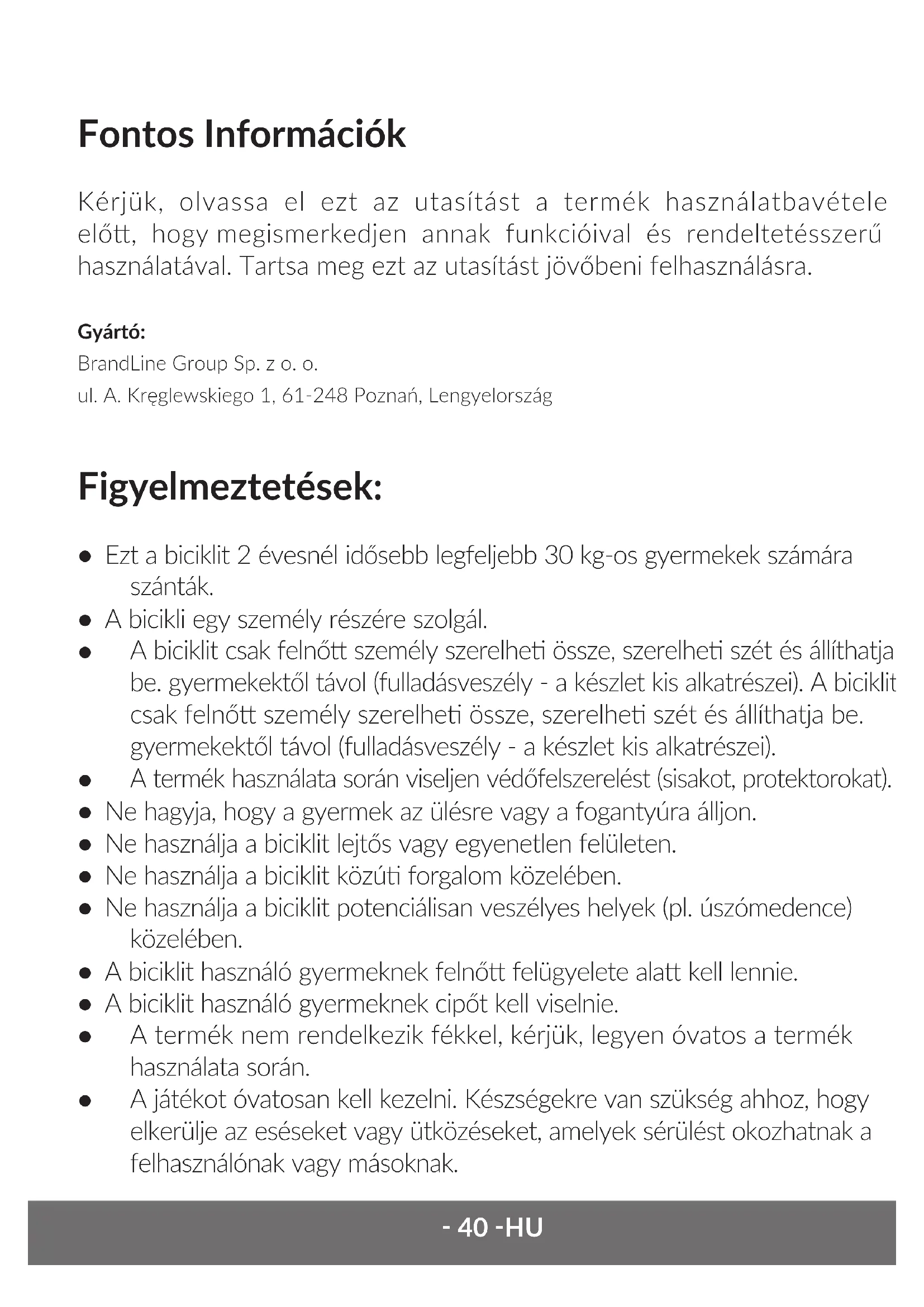 Kedves Ügyfelünk! Ha bármilyen észrevétele vagy kérdése van a vásárolt termékről, lépjen kapcsolatba velünk: help@lionelo.com‑ 40 ‑HU Fontos Információk Kérjük, olvassa el ezt az utasítást a termék használatbavétele elő, hogy megismerkedjen annak funkcióival és rendeltetésszerű használatával. Tartsa meg ezt az utasítást jövőbeni felhasználásra. Gyártó: BrandLine Group Sp. z o. o. ul. A. Kręglewskiego 1, 61-248 Poznań, Lengyelország Figyelmeztetések: