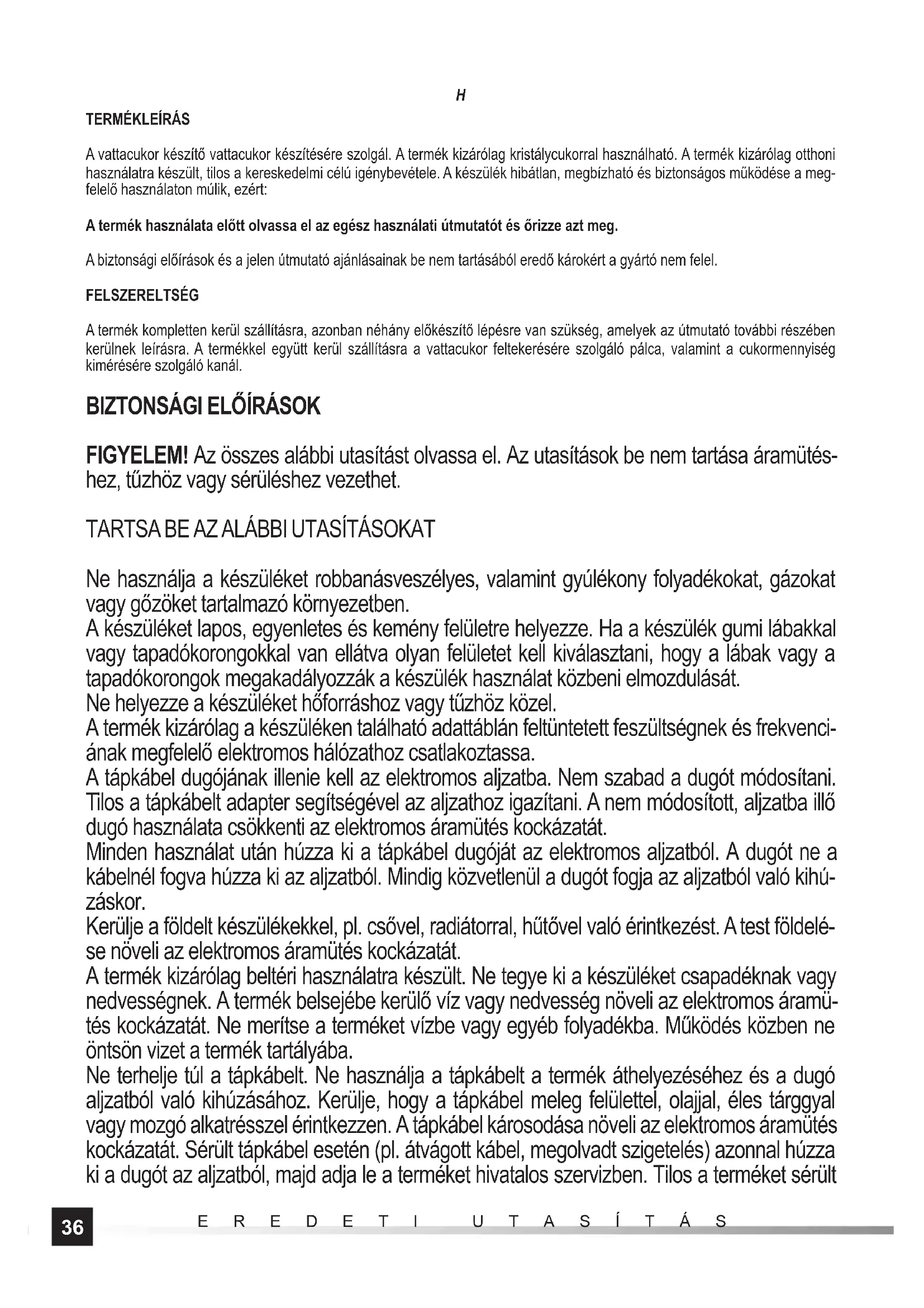 A vattacukor készítő vattacukor készítésére szolgál. A termék kizárólag kristálycukorral használható. A termék kizárólag otthoni használatra készült, tilos a kereskedelmi célú igénybevétele. A készülék hibátlan, megbízható és biztonságos működése a meg- felelő használaton múlik, ezért: A termék használata előtt olvassa el az egész használati útmutatót és őrizze azt meg. A biztonsági előírások és a jelen útmutató ajánlásainak be nem tartásából eredő károkért a gyártó nem felel. FELSZERELTSÉG A termék kompletten kerül szállításra, azonban néhány előkészítő lépésre van szükség, amelyek az útmutató további részében kerülnek leírásra. A termékkel együtt kerül szállításra a vattacukor feltekerésére szolgáló pálca, valamint a cukormennyiség kimérésére szolgáló kanál.