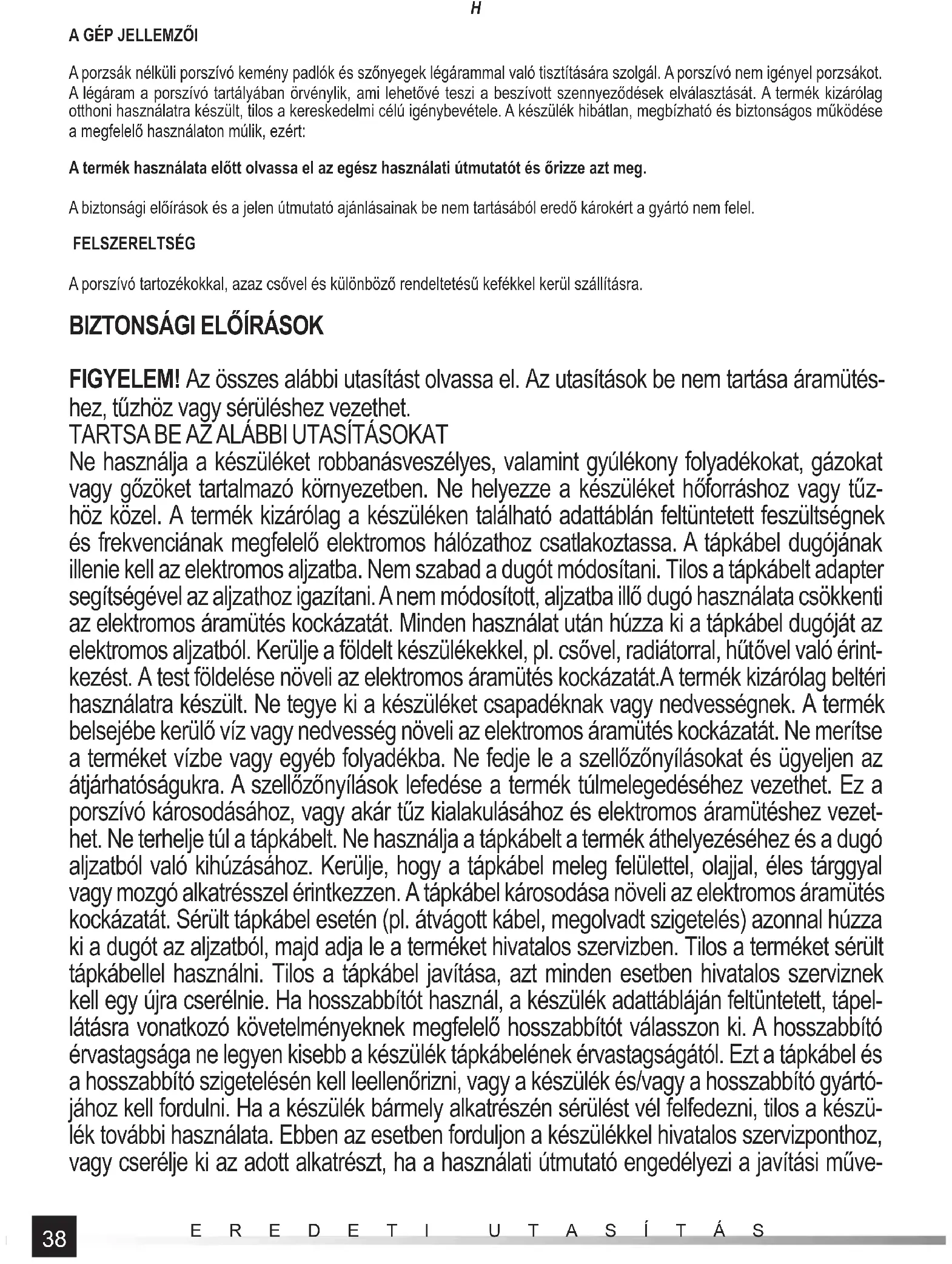 FIGYELEM! Az összes alábbi utasítást olvassa el. Az utasítások be nem tartása áramütés- hez, tűzhöz vagy sérüléshez vezethet. TARTSA BE AZ ALÁBBI UTASÍTÁSOKAT Ne használja a készüléket robbanásveszélyes, valamint gyúlékony folyadékokat, gázokat vagy gőzöket tartalmazó környezetben. Ne helyezze a készüléket hőforráshoz vagy tűz- höz közel. A termék kizárólag a készüléken található adattáblán feltüntetett feszültségnek és frekvenciának megfelelő elektromos hálózathoz csatlakoztassa. A tápkábel dugójának illenie kell az elektromos aljzatba. Nem szabad a dugót módosítani. Tilos a tápkábelt adapter segítségével az aljzathoz igazítani. A nem módosított, aljzatba illő dugó használata csökkenti az elektromos áramütés kockázatát. Minden használat után húzza ki a tápkábel dugóját az elektromos aljzatból. Kerülje a földelt készülékekkel, pl. csővel, radiátorral, hűtővel való érint- kezést. A test földelése növeli az elektromos áramütés kockázatát.A termék kizárólag beltéri használatra készült. Ne tegye ki a készüléket csapadéknak vagy nedvességnek. A termék belsejébe kerülő víz vagy nedvesség növeli az elektromos áramütés kockázatát. Ne merítse a terméket vízbe vagy egyéb folyadékba. Ne fedje le a szellőzőnyílásokat és ügyeljen az átjárhatóságukra. A szellőzőnyílások lefedése a termék túlmelegedéséhez vezethet. Ez a porszívó károsodásához, vagy akár tűz kialakulásához és elektromos áramütéshez vezet- het. Ne terhelje túl a tápkábelt. Ne használja a tápkábelt a termék áthelyezéséhez és a dugó aljzatból való kihúzásához. Kerülje, hogy a tápkábel meleg felülettel, olajjal, éles tárggyal vagy mozgó alkatrésszel érintkezzen. A tápkábel károsodása növeli az elektromos áramütés kockázatát. Sérült tápkábel esetén (pl. átvágott kábel, megolvadt szigetelés) azonnal húzza ki a dugót az aljzatból, majd adja le a terméket hivatalos szervizben. Tilos a terméket sérült tápkábellel használni. Tilos a tápkábel javítása, azt minden esetben hivatalos szerviznek kell egy újra cserélnie. Ha hosszabbítót használ, a készülék adattábláján feltüntetett, tápel- látásra vonatkozó követelményeknek megfelelő hosszabbítót válasszon ki. A hosszabbító érvastagsága ne legyen kisebb a készülék tápkábelének érvastagságától. Ezt a tápkábel és a hosszabbító szigetelésén kell leellenőrizni, vagy a készülék és/vagy a hosszabbító gyártó- jához kell fordulni. Ha a készülék bármely alkatrészén sérülést vél felfedezni, tilos a készü- lék további használata. Ebben az esetben forduljon a készülékkel hivatalos szervizponthoz, vagy cserélje ki az adott alkatrészt, ha a használati útmutató engedélyezi a javítási műve-39