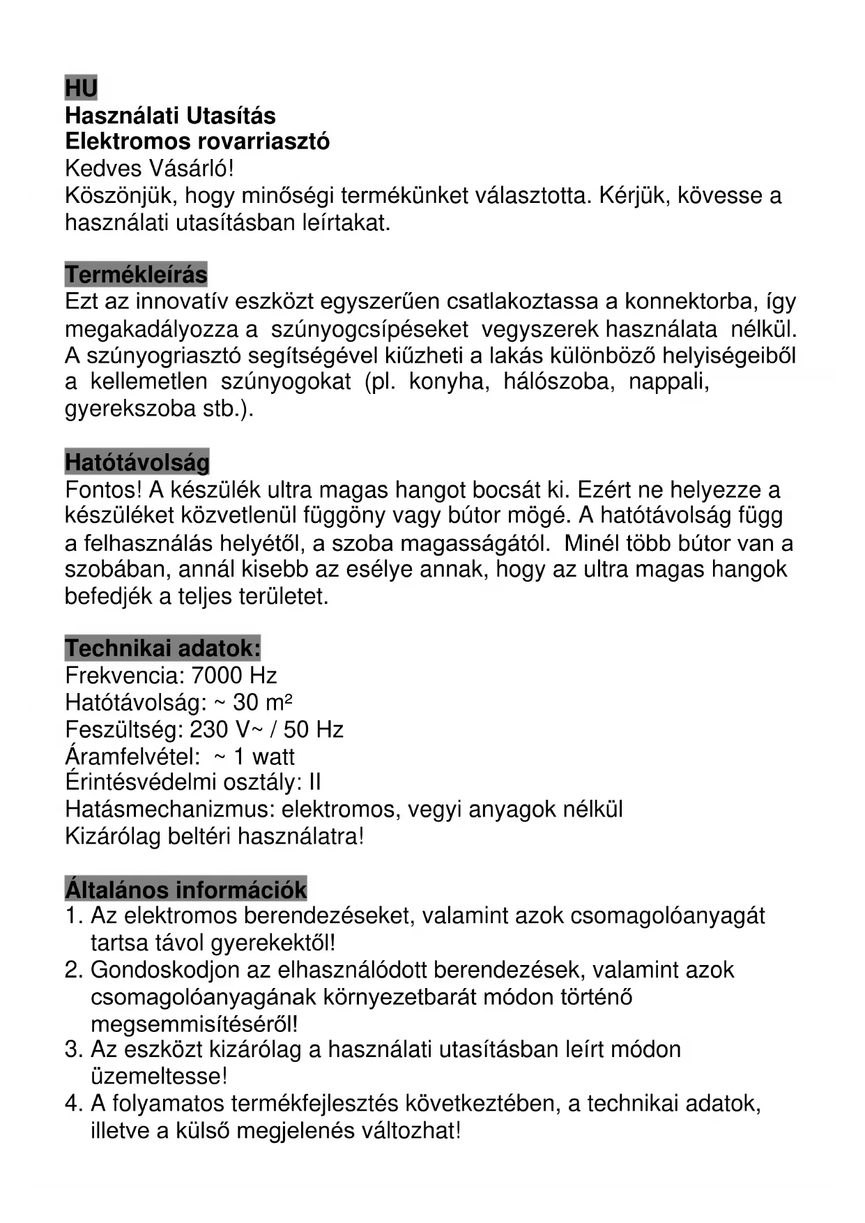 Indicaţii privind protecţia mediului Acest produs, la sfârşitul duratei sale de viaţă, nu poate fi evacuat pe calea obişnuită a deşeurilor menajere, ci trebuie predat la un punct de colectare pentru reciclarea aparatelor electrice şi electronice. Acest lucru este indicat prin simbolul aplicat pe produs, pe instrucţiunile de utilizare sau pe ambalajul acestuia. Materialele sunt refolosibile conform marcajelor de pe ele. Prin refolosire, prin valorificare materială sau prin alte forme de valorificare a aparatelor folosite, aduceţi o contribuţie importantă la protecţia mediului ambiant.Vă rugăm să vă interesaţi la autorităţile locale cu privire la punctul corespunzător de colectare.HU Használati Utasítás Elektromos rovarriasztó Kedves Vásárló! Köszönjük, hogy minőségi termékünket választotta. Kérjük, kövesse a használati utasításban leírtakat. Termékleírás Ezt az innovatív eszközt egyszerűen csatlakoztassa a konnektorba, így megakadályozza a szúnyogcsípéseket vegyszerek használata nélkül. A szúnyogriasztó segítségével kiűzheti a lakás különböző helyiségeiből a kellemetlen szúnyogokat (pl. konyha, hálószoba, nappali, gyerekszoba stb.). Hatótávolság Fontos! A készülék ultra magas hangot bocsát ki. Ezért ne helyezze a készüléket közvetlenül függöny vagy bútor mögé. A hatótávolság függ a felhasználás helyétől, a szoba magasságától. Minél több bútor van a szobában, annál kisebb az esélye annak, hogy az ultra magas hangok befedjék a teljes területet. Technikai adatok: Frekvencia: 7000 Hz Hatótávolság: ~ 30 m² Feszültség: 230 V~ / 50 Hz Áramfelvétel: ~ 1 watt Érintésvédelmi osztály: II Hatásmechanizmus: elektromos, vegyi anyagok nélkül Kizárólag beltéri használatra! Általános információk