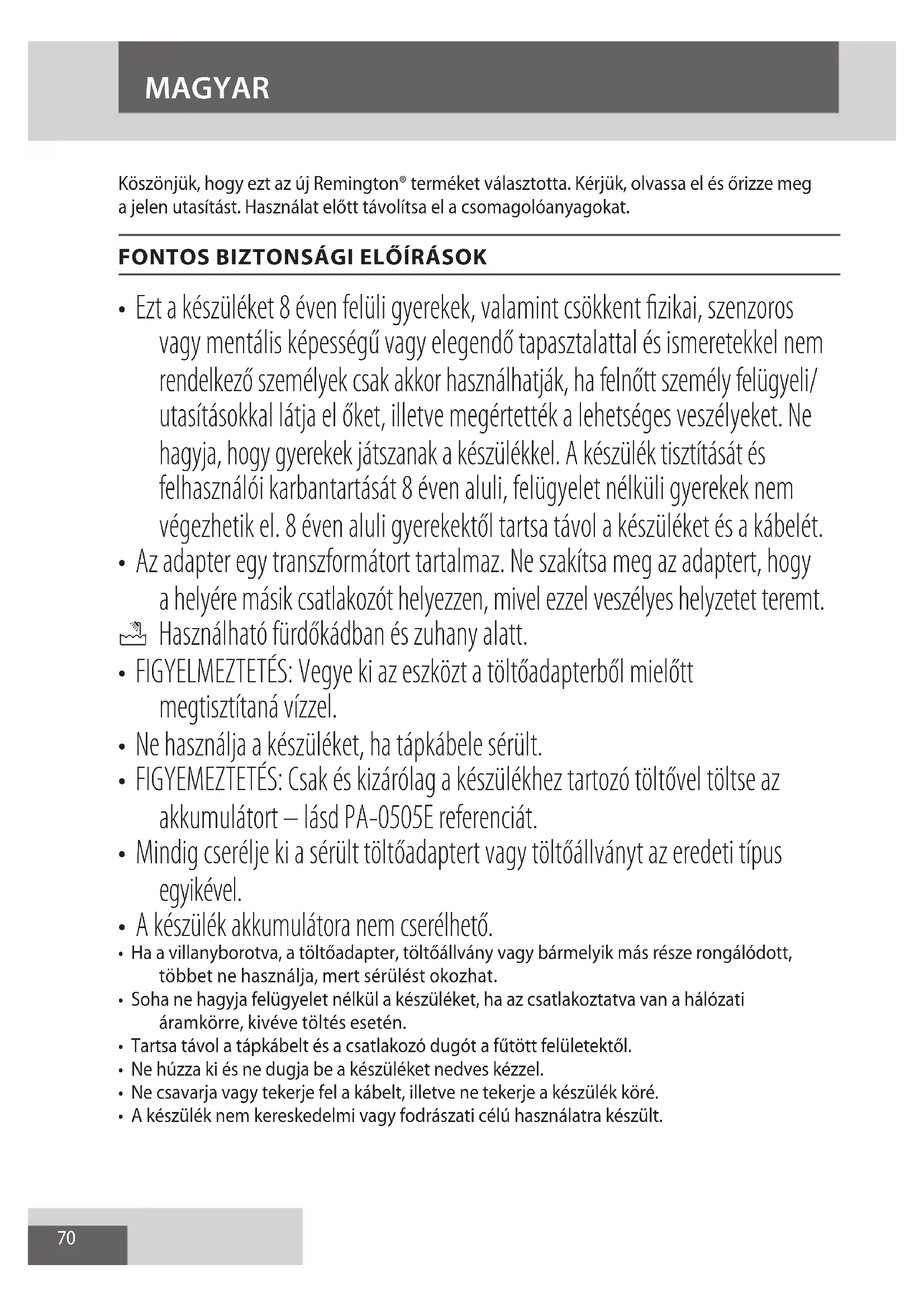 AE70 Köszönjük, hogy ezt az új Remington® terméket választotta. Kérjük, olvassa el és őrizze meg a jelen utasítást. Használat előtt távolítsa el a csomagolóanyagokat.