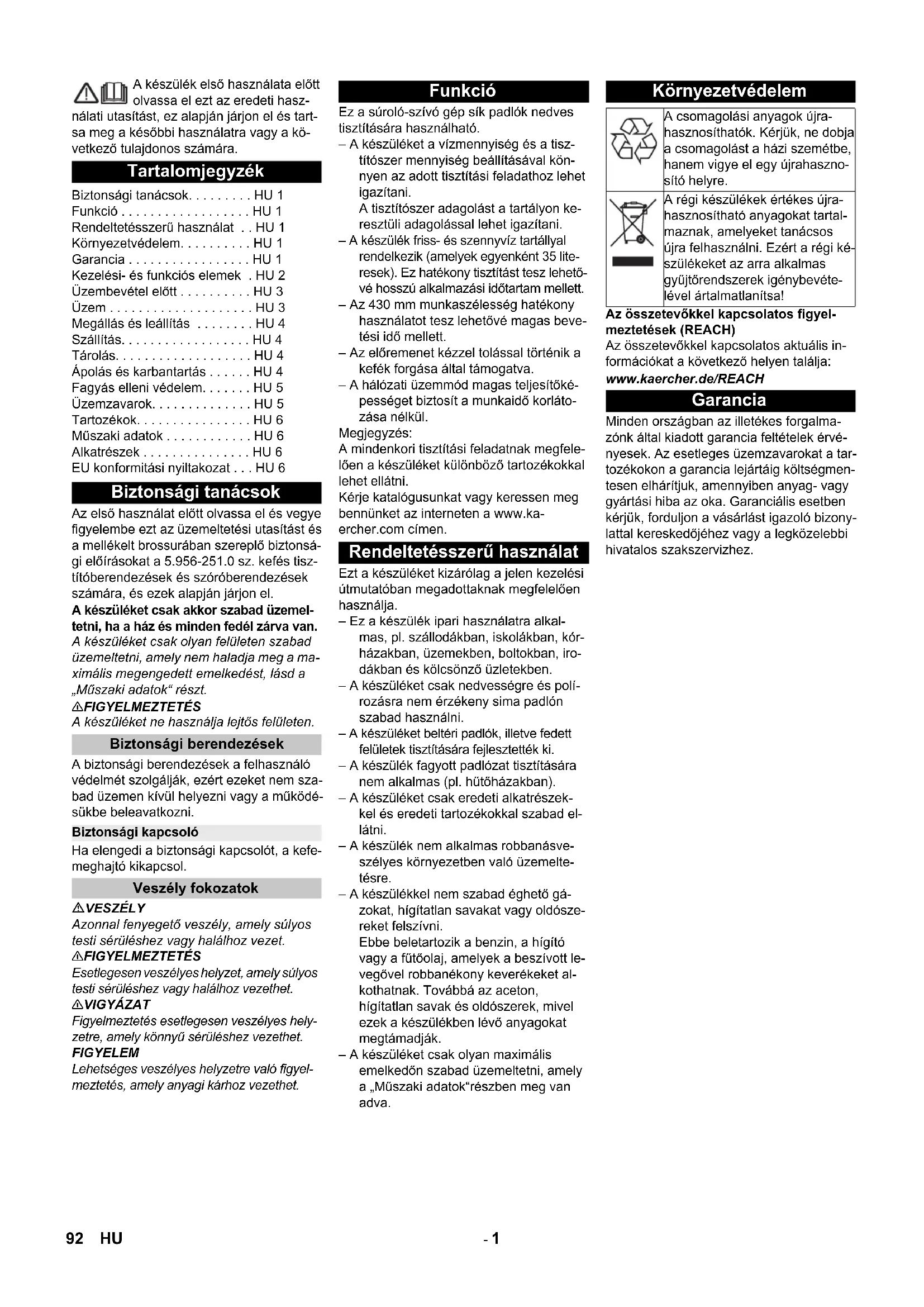Chairman of the Board of Management Director Regulatory Affairs & Certification 91RU- 1 A készülék első használata előtt olvassa el ezt az eredeti hasz- nálati utasítást, ez alapján járjon el és tart- sa meg a későbbi használatra vagy a kö- vetkező tulajdonos számára. Az első használat előtt olvassa el és vegye figyelembe ezt az üzemeltetési utasítást és a mellékelt brossurában szereplő biztonsá- gi előírásokat a 5.956-251.0 sz. kefés tisz- títóberendezések és szóróberendezések számára, és ezek alapján járjon el. A készüléket csak akkor szabad üzemel- tetni, ha a ház és minden fedél zárva van. A készüléket csak olyan felületen szabad üzemeltetni, amely nem haladja meg a ma- ximális megengedett emelkedést, lásd a „Műszaki adatok“ részt. 몇 FIGYELMEZTETÉS A készüléket ne használja lejtős felületen. A biztonsági berendezések a felhasználó védelmét szolgálják, ezért ezeket nem sza- bad üzemen kívül helyezni vagy a működé- sükbe beleavatkozni. Ha elengedi a biztonsági kapcsolót, a kefe- meghajtó kikapcsol. VESZÉLY Azonnal fenyegető veszély, amely súlyos testi sérüléshez vagy halálhoz vezet. 몇 FIGYELMEZTETÉS Esetlegesen veszélyes helyzet, amely súlyos testi sérüléshez vagy halálhoz vezethet. 몇 VIGYÁZAT Figyelmeztetés esetlegesen veszélyes hely- zetre, amely könnyű sérüléshez vezethet. FIGYELEM Lehetséges veszélyes helyzetre való figyel- meztetés, amely anyagi kárhoz vezethet. Ez a súroló-szívó gép sík padlók nedves tisztítására használható. – A készüléket a vízmennyiség és a tisz- títószer mennyiség beállításával kön- nyen az adott tisztítási feladathoz lehet igazítani. A tisztítószer adagolást a tartályon ke- resztüli adagolással lehet igazítani. – A készülék friss- és szennyvíz tartállyal rendelkezik (amelyek egyenként 35 lite- resek). Ez hatékony tisztítást tesz lehető- vé hosszú alkalmazási időtartam mellett. – Az 430 mm munkaszélesség hatékony használatot tesz lehetővé magas beve- tési idő mellett. – Az előremenet kézzel tolással történik a kefék forgása által támogatva. – A hálózati üzemmód magas teljesítőké- pességet biztosít a munkaidő korláto- zása nélkül. Megjegyzés: A mindenkori tisztítási feladatnak megfele- lően a készüléket különböző tartozékokkal lehet ellátni. Kérje katalógusunkat vagy keressen meg bennünket az interneten a www.ka- ercher.com címen. Ezt a készüléket kizárólag a jelen kezelési útmutatóban megadottaknak megfelelően használja. – Ez a készülék ipari használatra alkal- mas, pl. szállodákban, iskolákban, kór- házakban, üzemekben, boltokban, iro- dákban és kölcsönző üzletekben. – A készüléket csak nedvességre és polí- rozásra nem érzékeny sima padlón szabad használni. – A készüléket beltéri padlók, illetve fedett felületek tisztítására fejlesztették ki. – A készülék fagyott padlózat tisztítására nem alkalmas (pl. hűtőházakban). – A készüléket csak eredeti alkatrészek- kel és eredeti tartozékokkal szabad el- látni. – A készülék nem alkalmas robbanásve- szélyes környezetben való üzemelte- tésre. – A készülékkel nem szabad éghető gá- zokat, hígítatlan savakat vagy oldósze- reket felszívni. Ebbe beletartozik a benzin, a hígító vagy a fűtőolaj, amelyek a beszívott le- vegővel robbanékony keverékeket al- kothatnak. Továbbá az aceton, hígítatlan savak és oldószerek, mivel ezek a készülékben lévő anyagokat megtámadják. – A készüléket csak olyan maximális emelkedőn szabad üzemeltetni, amely a „Műszaki adatok“részben meg van adva. Az összetevőkkel kapcsolatos figyel- meztetések (REACH) Az összetevőkkel kapcsolatos aktuális in- formációkat a következő helyen találja: www.kaercher.de/REACH Minden országban az illetékes forgalma- zónk által kiadott garancia feltételek érvé- nyesek. Az esetleges üzemzavarokat a tar- tozékokon a garancia lejártáig költségmen- tesen elhárítjuk, amennyiben anyag- vagy gyártási hiba az oka. Garanciális esetben kérjük, forduljon a vásárlást igazoló bizony- lattal kereskedőjéhez vagy a legközelebbi hivatalos szakszervizhez. Tartalomjegyzék Biztonsági tanácsok. . . . . . . . . HU 1 Funkció . . . . . . . . . . . . . . . . . . HU 1 Rendeltetésszerű használat . . HU 1 Környezetvédelem. . . . . . . . . . HU 1 Garancia . . . . . . . . . . . . . . . . . HU 1 Kezelési- és funkciós elemek . HU 2 Üzembevétel előtt . . . . . . . . . . HU 3 Üzem . . . . . . . . . . . . . . . . . . . . HU 3 Megállás és leállítás . . . . . . . . HU 4 Szállítás. . . . . . . . . . . . . . . . . . HU 4 Tárolás. . . . . . . . . . . . . . . . . . . HU 4 Ápolás és karbantartás . . . . . . HU 4 Fagyás elleni védelem. . . . . . . HU 5 Üzemzavarok. . . . . . . . . . . . . . HU 5 Tartozékok. . . . . . . . . . . . . . . . HU 6 Műszaki adatok . . . . . . . . . . . . HU 6 Alkatrészek . . . . . . . . . . . . . . . HU 6 EU konformitási nyiltakozat . . . HU 6 Biztonsági tanácsok Biztonsági berendezések Biztonsági kapcsoló Veszély fokozatok Funkció Rendeltetésszerű használat Környezetvédelem A csomagolási anyagok újra- hasznosíthatók. Kérjük, ne dobja a csomagolást a házi szemétbe, hanem vigye el egy újrahaszno- sító helyre. A régi készülékek értékes újra- hasznosítható anyagokat tartal- maznak, amelyeket tanácsos újra felhasználni. Ezért a régi ké- szülékeket az arra alkalmas gyűjtőrendszerek igénybevéte- lével ártalmatlanítsa! Garancia 92 HU- 2 1 Szálszűrő 2 Biztonsági kapcsoló 3 Szennyvízleeresztő tömlő adagolóbe- rendezéssel 4 Tartósín a Homebase számára 5 Úszó 6 Friss víz tartály 7 Friss víz tartály teteje 8 Markolat mélyedése 9 Tisztítófej 10 Kefekorong 11 Tisztavíz tartály betölt