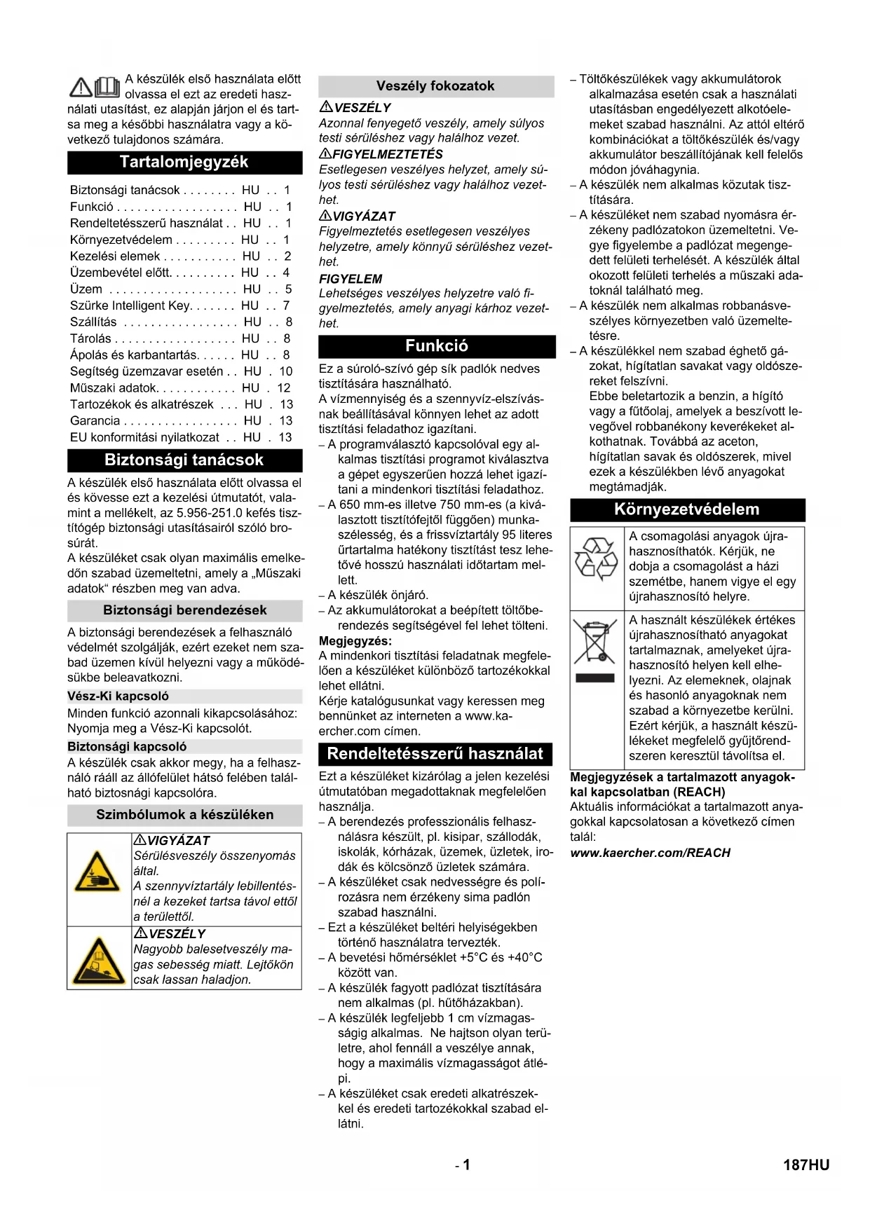 Chairman of the Board of Management Director Regulatory Affairs & Certification 186 RU- 1 A készülék első használata előtt olvassa el ezt az eredeti hasz- nálati utasítást, ez alapján járjon el és tart- sa meg a későbbi használatra vagy a kö- vetkező tulajdonos számára. A készülék első használata előtt olvassa el és kövesse ezt a kezelési útmutatót, vala- mint a mellékelt, az 5.956-251.0 kefés tisz- títógép biztonsági utasításairól szóló bro- súrát. A készüléket csak olyan maximális emelke- dőn szabad üzemeltetni, amely a „Műszaki adatok“ részben meg van adva. A biztonsági berendezések a felhasználó védelmét szolgálják, ezért ezeket nem sza- bad üzemen kívül helyezni vagy a működé- sükbe beleavatkozni. Minden funkció azonnali kikapcsolásához: Nyomja meg a Vész-Ki kapcsolót. A készülék csak akkor megy, ha a felhasz- náló rááll az állófelület hátsó felében talál- ható biztosnági kapcsolóra. VESZÉLY Azonnal fenyegető veszély, amely súlyos testi sérüléshez vagy halálhoz vezet. 몇 FIGYELMEZTETÉS Esetlegesen veszélyes helyzet, amely sú- lyos testi sérüléshez vagy halálhoz vezet- het. 몇 VIGYÁZAT Figyelmeztetés esetlegesen veszélyes helyzetre, amely könnyű sérüléshez vezet- het. FIGYELEM Lehetséges veszélyes helyzetre való fi- gyelmeztetés, amely anyagi kárhoz vezet- het. Ez a súroló-szívó gép sík padlók nedves tisztítására használható. A vízmennyiség és a szennyvíz-elszívás- nak beállításával könnyen lehet az adott tisztítási feladathoz igazítani. – A programválasztó kapcsolóval egy al- kalmas tisztítási programot kiválasztva a gépet egyszerűen hozzá lehet igazí- tani a mindenkori tisztítási feladathoz. – A 650 mm-es illetve 750 mm-es (a kivá- lasztott tisztítófejtől függően) munka- szélesség, és a frissvíztartály 95 literes űrtartalma hatékony tisztítást tesz lehe- tővé hosszú használati időtartam mel- lett. – A készülék önjáró. – Az akkumulátorokat a beépített töltőbe- rendezés segítségével fel lehet tölteni. Megjegyzés: A mindenkori tisztítási feladatnak megfele- lően a készüléket különböző tartozékokkal lehet ellátni. Kérje katalógusunkat vagy keressen meg bennünket az interneten a www.ka- ercher.com címen. Ezt a készüléket kizárólag a jelen kezelési útmutatóban megadottaknak megfelelően használja. – A berendezés professzionális felhasz- nálásra készült, pl. kisipar, szállodák, iskolák, kórházak, üzemek, üzletek, iro- dák és kölcsönző üzletek számára. – A készüléket csak nedvességre és polí- rozásra nem érzékeny sima padlón szabad használni. – Ezt a készüléket beltéri helyiségekben történő használatra tervezték. – A bevetési hőmérséklet +5°C és +40°C között van. – A készülék fagyott padlózat tisztítására nem alkalmas (pl. hűtőházakban). – A készülék legfeljebb 1 cm vízmagas- ságig alkalmas. Ne hajtson olyan terü- letre, ahol fennáll a veszélye annak, hogy a maximális vízmagasságot átlé- pi. – A készüléket csak eredeti alkatrészek- kel és eredeti tartozékokkal szabad el- látni. – Töltőkészülékek vagy akkumulátorok alkalmazása esetén csak a használati utasításban engedélyezett alkotóele- meket szabad használni. Az attól eltérő kombinációkat a töltőkészülék és/vagy akkumulátor beszállítójának kell felelős módon jóváhagynia. – A készülék nem alkalmas közutak tisz- títására. – A készüléket nem szabad nyomásra ér- zékeny padlózatokon üzemeltetni. Ve- gye figyelembe a padlózat megenge- dett felületi terhelését. A készülék által okozott felületi terhelés a műszaki ada- toknál található meg. – A készülék nem alkalmas robbanásve- szélyes környezetben való üzemelte- tésre. – A készülékkel nem szabad éghető gá- zokat, hígítatlan savakat vagy oldósze- reket felszívni. Ebbe beletartozik a benzin, a hígító vagy a fűtőolaj, amelyek a beszívott le- vegővel robbanékony keverékeket al- kothatnak. Továbbá az aceton, hígítatlan savak és oldószerek, mivel ezek a készülékben lévő anyagokat megtámadják. Megjegyzések a tartalmazott anyagok- kal kapcsolatban (REACH) Aktuális információkat a tartalmazott anya- gokkal kapcsolatosan a következő címen talál: www.kaercher.com/REACH Tartalomjegyzék Biztonsági tanácsok . . . . . . . . HU . . 1 Funkció . . . . . . . . . . . . . . . . . . HU . . 1 Rendeltetésszerű használat . . HU . . 1 Környezetvédelem . . . . . . . . . HU . . 1 Kezelési elemek . . . . . . . . . . . HU . . 2 Üzembevétel előtt. . . . . . . . . . HU . . 4 Üzem . . . . . . . . . . . . . . . . . . . HU . . 5 Szürke Intelligent Key. . . . . . . HU . . 7 Szállítás . . . . . . . . . . . . . . . . . HU . . 8 Tárolás . . . . . . . . . . . . . . . . . . HU . . 8 Ápolás és karbantartás. . . . . . HU . . 8 Segítség üzemzavar esetén . . HU . 10 Műszaki adatok. . . . . . . . . . . . HU . 12 Tartozékok és alkatrészek . . . HU . 13 Garancia . . . . . . . . . . . . . . . . . HU . 13 EU konformitási nyilatkozat . . HU . 13 Biztonsági tanácsok Biztonsági berendezések Vész-Ki kapcsoló Biztonsági kapcsoló Szimbólumok a készüléken 몇 VIGYÁZAT Sérülésveszély összenyomás által. A szennyvíztartály lebillentés- nél a kezeket tartsa távol ettől a területtől. VESZÉLY Nagyobb balesetveszély ma- gas sebesség miatt. Lejtőkön csak lassan haladjon. Veszély fokozatok Funkció Rendeltetésszerű használat Környezetvédelem A csomagolási anyagok újra- hasznosíthatók. Kérjük, ne dobja a csomagolást a házi szemétbe, hanem vigye el egy újrahasznosító helyre. A használt készülékek értékes újrahasznosítható anyagokat tartalmaznak, amelyeket újra- hasznosító helyen kell elhe- lyezni. Az elemeknek, olajnak és hason