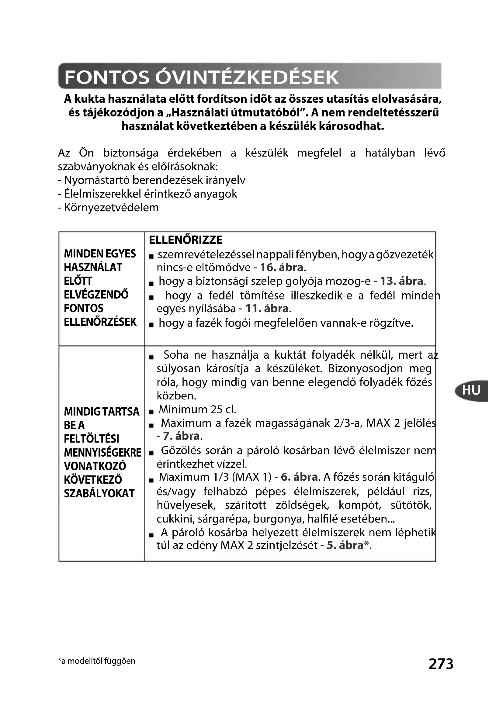 A kukta használata előtt fordítson időt az összes utasítás elolvasására, és tájékozódjon a „Használati útmutatóból”. A nem rendeltetésszerű használat következtében a készülék károsodhat. Az Ön biztonsága érdekében a készülék megfelel a hatályban lévő szabványoknak és előírásoknak: - Nyomástartó berendezések irányelv - Élelmiszerekkel érintkező anyagok - Környezetvédelem MINDEN EGYES HASZNÁLAT ELŐTT ELVÉGZENDŐ FONTOS
