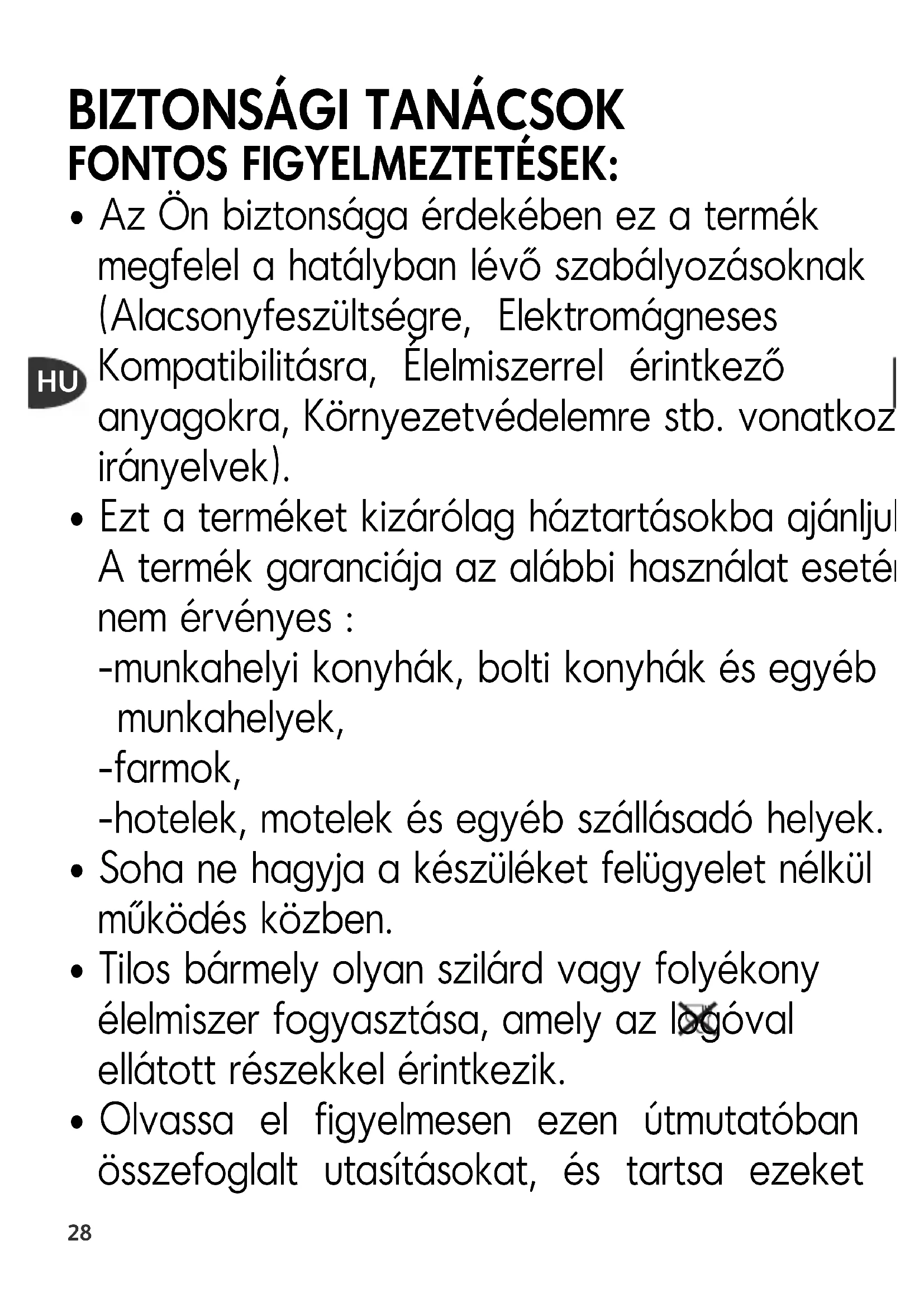- Ezt a terméket kizárólag háztartásokba ajánljuk. A termék garanciája az alábbi használat esetén nem érvényes : -munkahelyi konyhák, bolti konyhák és egyéb munkahelyek, -farmok, -hotelek, motelek és egyéb szállásadó helyek.
