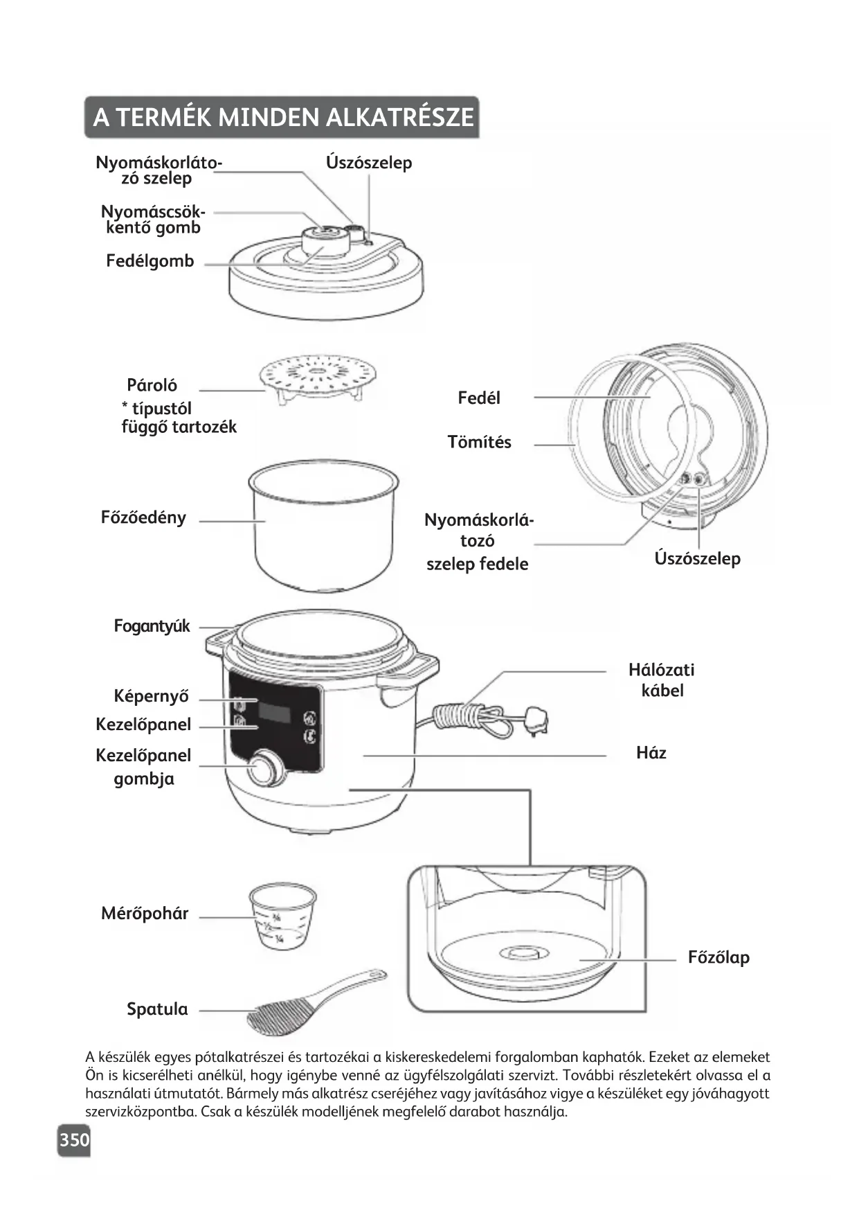 OK350 Kezelőpanel Főzőedény Pároló Fogantyúk Képernyő Kezelőpanel gombja Mérőpohár Spatula Főzőlap Hálózati kábel Ház Fedélgomb Nyomáscsök- kentő gomb Nyomáskorláto- zó szelep Úszószelep Úszószelep Tömítés Nyomáskorlá- tozó szelep fedele Fedél