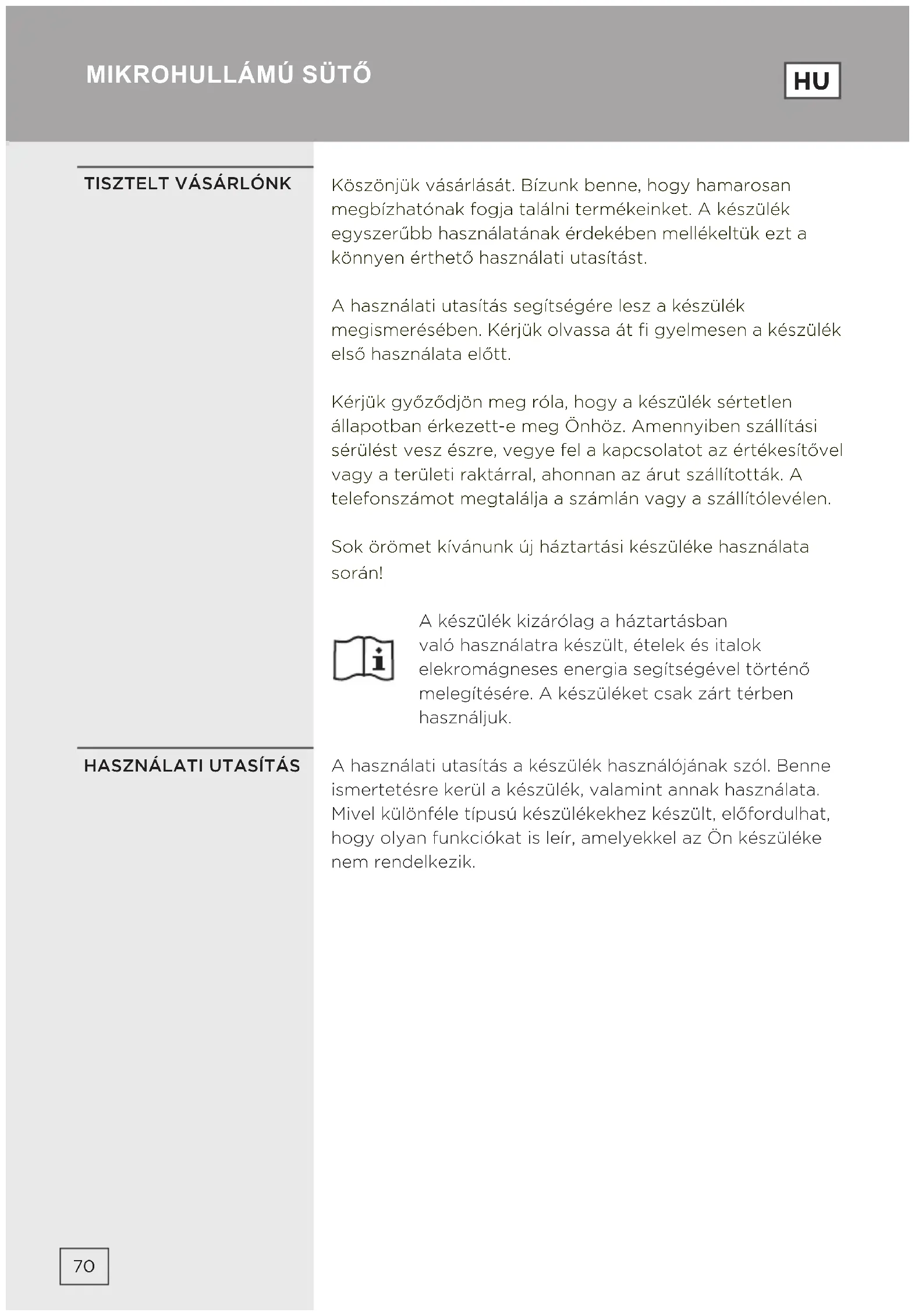 Köszönjük vásárlását. Bízunk benne, hogy hamarosan megbízhatónak fogja találni termékeinket. A készülék egyszerűbb használatának érdekében mellékeltük ezt a könnyen érthető használati utasítást. A használati utasítás segítségére lesz a készülék megismerésében. Kérjük olvassa át fi gyelmesen a készülék első használata előtt. Kérjük győződjön meg róla, hogy a készülék sértetlen állapotban érkezett-e meg Önhöz. Amennyiben szállítási sérülést vesz észre, vegye fel a kapcsolatot az értékesítővel vagy a területi raktárral, ahonnan az árut szállították. A telefonszámot megtalálja a számlán vagy a szállítólevélen. Sok örömet kívánunk új háztartási készüléke használata során! A készülék kizárólag a háztartásban való használatra készült, ételek és italok elekromágneses energia segítségével történő melegítésére. A készüléket csak zárt térben használjuk. A használati utasítás a készülék használójának szól. Benne ismertetésre kerül a készülék, valamint annak használata. Mivel különféle típusú készülékekhez készült, előfordulhat, hogy olyan funkciókat is leír, amelyekkel az Ön készüléke nem rendelkezik.