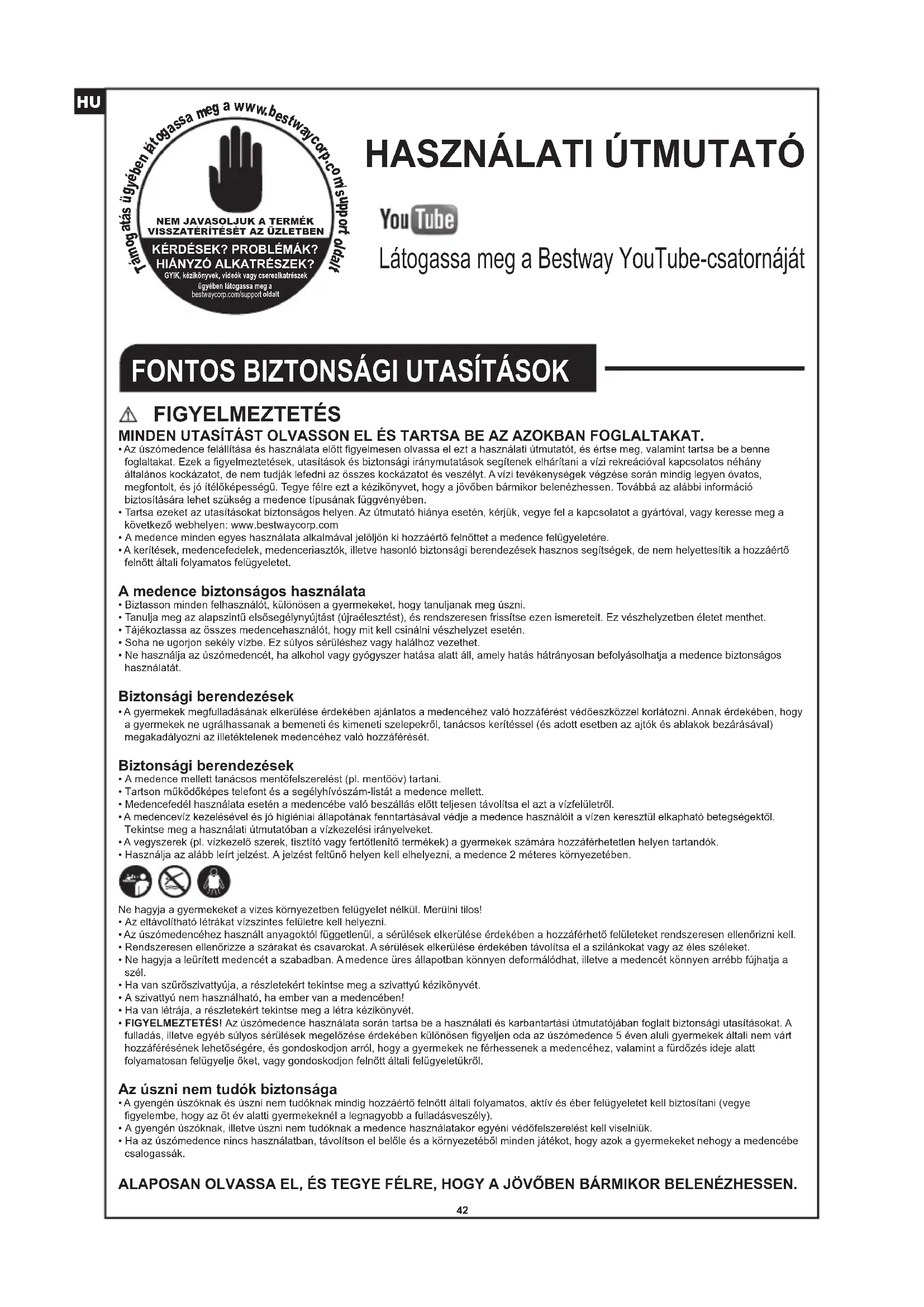 Látogassa meg a Bestway YouTube-csatornáját FIGYELMEZTETÉS MINDEN UTASÍTÁST OLVASSON EL ÉS TARTSA BE AZ AZOKBAN FOGLALTAKAT.
