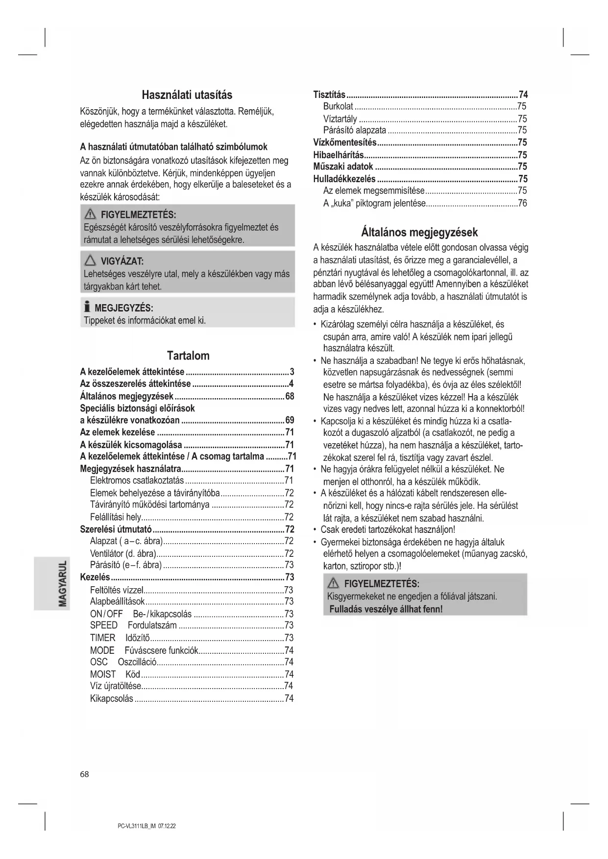 - Gyermekei biztonsága érdekében ne hagyja általuk elérhető helyen a csomagolóelemeket (műanyag zacskó, karton, sztiropor stb.)! FIGYELMEZTETÉS: Kisgyermekeket ne engedjen a fóliával játszani. Fulladás veszélye állhat fenn!PC-VL3111LB_IM 07.12.22