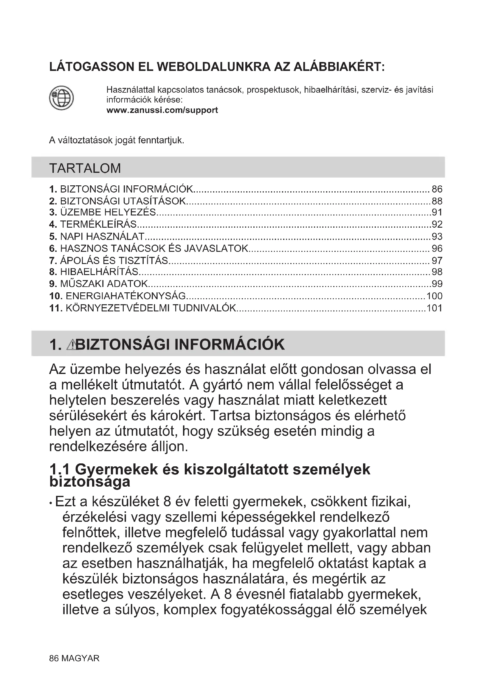 A következő jelzéssel ellátott anyagokat hasznosítsa újra. Újrahasznosításhoz tegye a megfelelő konténerekbe a csomagolást. Járuljon hozzá környezetünk és egészségünk védelméhez, és hasznosítsa újra az elektromos és elektronikus hulladékot. A tiltó szimbólummal ellátott készüléket ne dobja a háztartási hulladék közé. Juttassa el a készüléket a helyi újrahasznosító telepre, vagy lépjen kapcsolatba a hulladékkezelésért felelős hivatallal. MAGYAR 101VISITE O NOSSO WEBSITE PARA: Obter conselhos de utilização, folhetos, resolução de problemas e informações sobreassistência e reparações:www.zanussi.com/supportSujeito a alterações sem aviso prévio. ÍNDICE