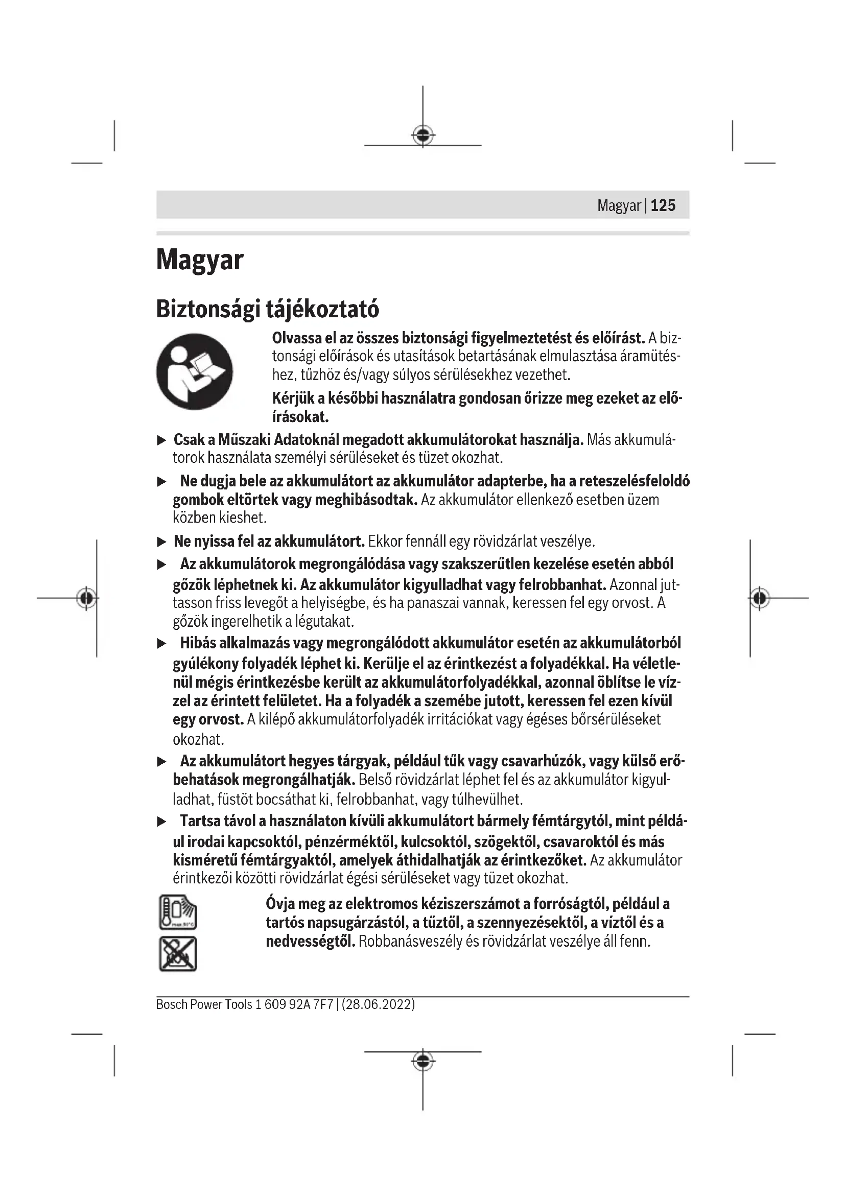 A fűtőelem nem melegszik fel. Az akkumulátor feltöltése Kösse össze a fűtőelem kábelét a(1)akkumulátor adapteren található(2)hüvellyel. Aktiválja a(1)akkumulátor adaptert, ehhez nyomja meg a(5)BE-gombot. A ruhadarabot a berendezés nem fűti és a külső USB-készülék nem kerül feltöltésre. Vegye ki az akkumulátort az adapterből. Várjon 10másodpercet Tegye be ismét az akkumulátort az adapterbe. A) Egyes külső USB-berendezéseket a műszaki adatok megegyezése ellenére sem lehet ezzel az ak- kumulátor adapterrel felölteni. Karbantartás és szerviz Vevőszolgálat és alkalmazási tanácsadás A vevőszolgálat a terméke javításával és karbantartásával, valamint a pótalkatrészekkel kapcsolatos kérdésekre szívesen válaszol. A pótalkatrészekkel kapcsolatos robbantott ábrák és egyéb információk a következő címen találhatók: www.bosch-pt.com A Bosch Alkalmazási Tanácsadó Team a termékeinkkel és azok tartozékaival kapcsolatos kérdésekben szívesen nyújt segítséget. Ha kérdései vannak vagy pótalkatrészeket szeretne rendelni, okvetlenül adja meg a ter- mék típustábláján található 10‑jegyű cikkszámot. Magyarország Robert Bosch Kft. 1103 Budapest Gyömrői út. 120. 1 609 92A 7F7 | (28.06.2022) Bosch Power ToolsMagyar | 131 A www.bosch-pt.hu oldalon online megrendelheti készülékének javítását. Tel.:+3618798502 Fax: +3618798505 info.bsc@hu.bosch.com www.bosch-pt.hu További szerviz-címek itt találhatók: www.bosch-pt.com/serviceaddresses Szállítás Az lithium-ion akkumulátorokra a veszélyes árukra vonatkozó követelmények érvénye- sek. A felhasználók az akkumulátorokat a közúti szállításban minden további nélkül szál- líthatják. Ha az akkumulátorok szállításával harmadik személyt (például: légi vagy egyéb szállító vállalatot) bíznak meg, akkor figyelembe kell venni a csomagolásra és a megjelölésre vo- natkozó különleges követelményeket. Ebben az esetben a küldemény előkészítésébe be kell vonni egy veszélyes áru szakembert. Csak akkor küldje el az akkumulátort, ha a háza nincs megrongálódva. Ragassza le a nyi- tott érintkezőket és csomagolja be úgy az akkumulátort, hogy az a csomagoláson belül ne mozoghasson. Vegye figyelembe az adott országon belüli, az előbbieknél esetleg szigo- rúbb helyi előírásokat. Hulladékkezelés Az elektromos készülékeket, az akkumulátorokat/elemeket, a tartozékokat és a csomagolóanyagokat a környezetvédelmi szempontoknak megfelelően kell új- rafelhasználásra leadni. Ne dobja ki az elektromos készülékeket és az akkumulátorokat/elemeket a ház- tartási szemétbe! Csak az EU‑tagországok számára: Az elektromos és elektronikus berendezések hulladékairól szóló 2012/19/EU európai irányelvnek és a nemzeti jogba való átültetésének megfelelően a már nem használható elektromos készülékeket és a 2006/66/EK európai irányelvnek megfelelően a már nem használható akkumulátorokat/elemeket külön össze kell gyűjteni és a környezetvédelmi szempontoknak megfelelően kell újrafelhasználásra leadni. Szakszerűtlen ártalmatlanítás esetén a már használhatatlan elektromos és elektronikus készülékek a bennük esetleg található veszélyes anyagok következtében káros hatással lehetnek a környezetre és az emberek egészségére. Bosch Power Tools 1 609 92A 7F7 | (28.06.2022)132 | Русский Akkumulátorok/elemek: Li-ion: Kérjük, vegye figyelembe a (lásd „Szállítás”, Oldal131) „Szállítás” fejezetben található tájékoztatót.