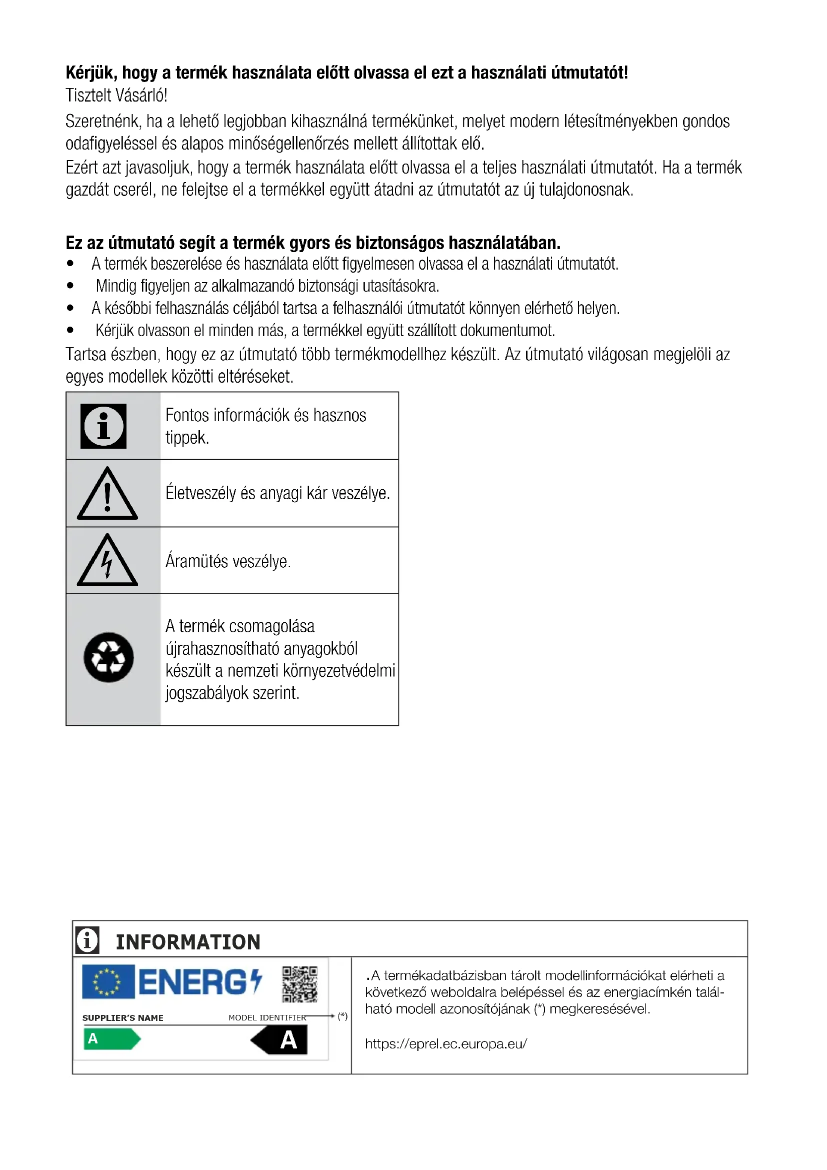 Áramütés veszélye. A termék csomagolása újrahasznosítható anyagokból készült a nemzeti környezetvédelmi jogszabályok szerint. .A termékadatbázisban tárolt modellinformációkat elérheti a következő weboldalra belépéssel és az energiacímkén talál-ható modell azonosítójának (*) megkeresésével.https://eprel.ec.europa.eu/