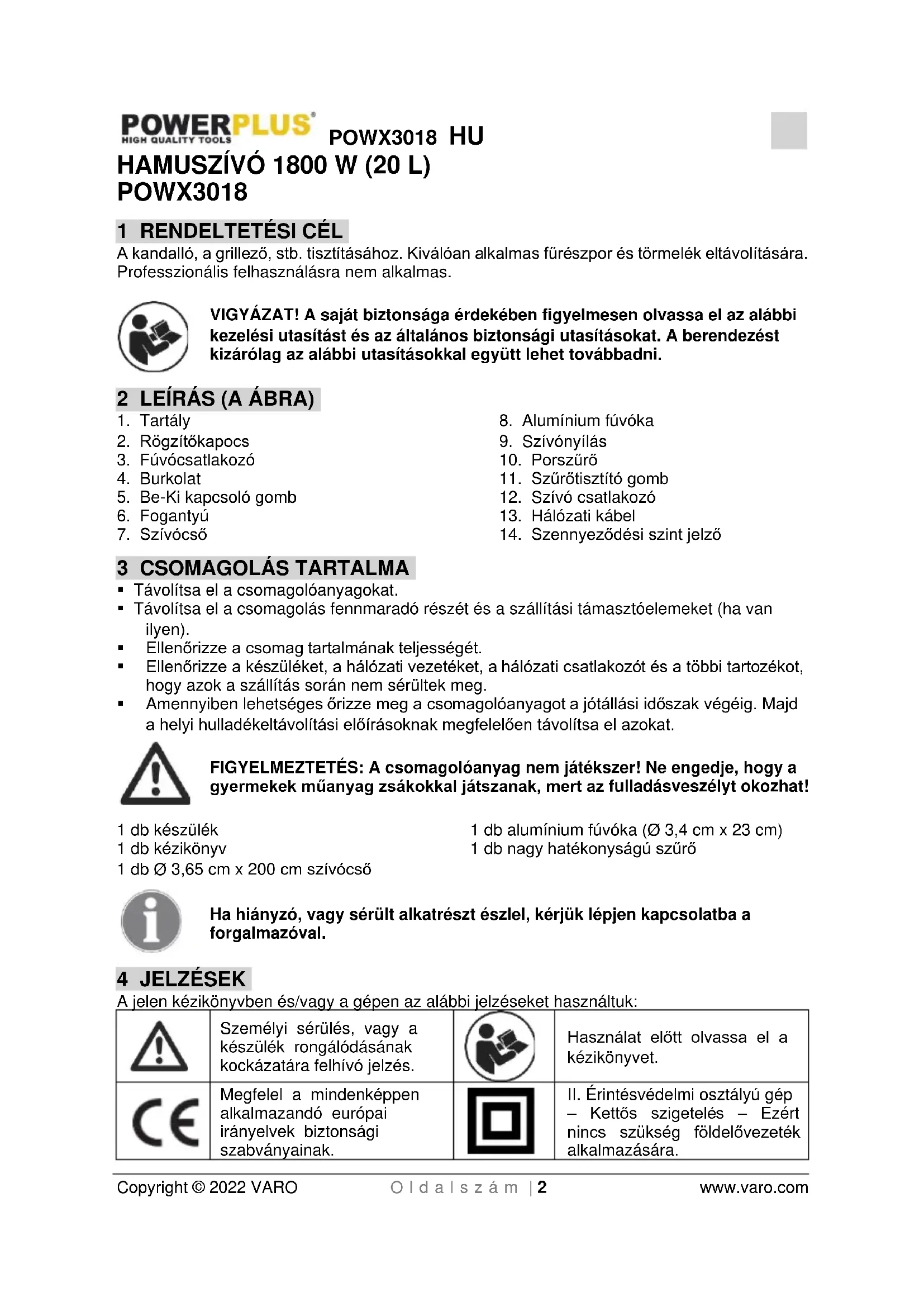 - Tilos lisztet, cementet, stb. porszívózni a túlterhelés elkerülése érdekében.POWX3018 HU Copyright © 2022 VARO O l d a l s z á m | 5 www.varo.com