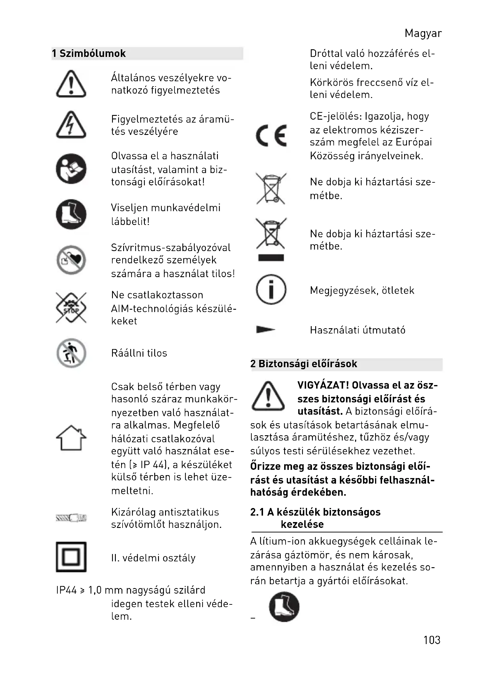 IP44 ≥ 1,0 mm nagyságú szilárd idegen testek elleni véde lem. Dróttal való hozzáférés el leni védelem. Körkörös freccsenő víz el leni védelem. CE-jelölés: Igazolja, hogy az elektromos kéziszer szám megfelel az Európai Közösség irányelveinek. Ne dobja ki háztartási sze métbe. Ne dobja ki háztartási sze métbe. Megjegyzések, ötletek Használati útmutató 2 Biztonsági előírások VIGYÁZAT! Olvassa el az ösz szes biztonsági előírást és utasítást. A biztonsági előírá sok és utasítások betartásának elmu lasztása áramütéshez, tűzhöz és/vagy súlyos testi sérülésekhez vezethet. Őrizze meg az összes biztonsági előí rást és utasítást a későbbi felhasznál hatóság érdekében.