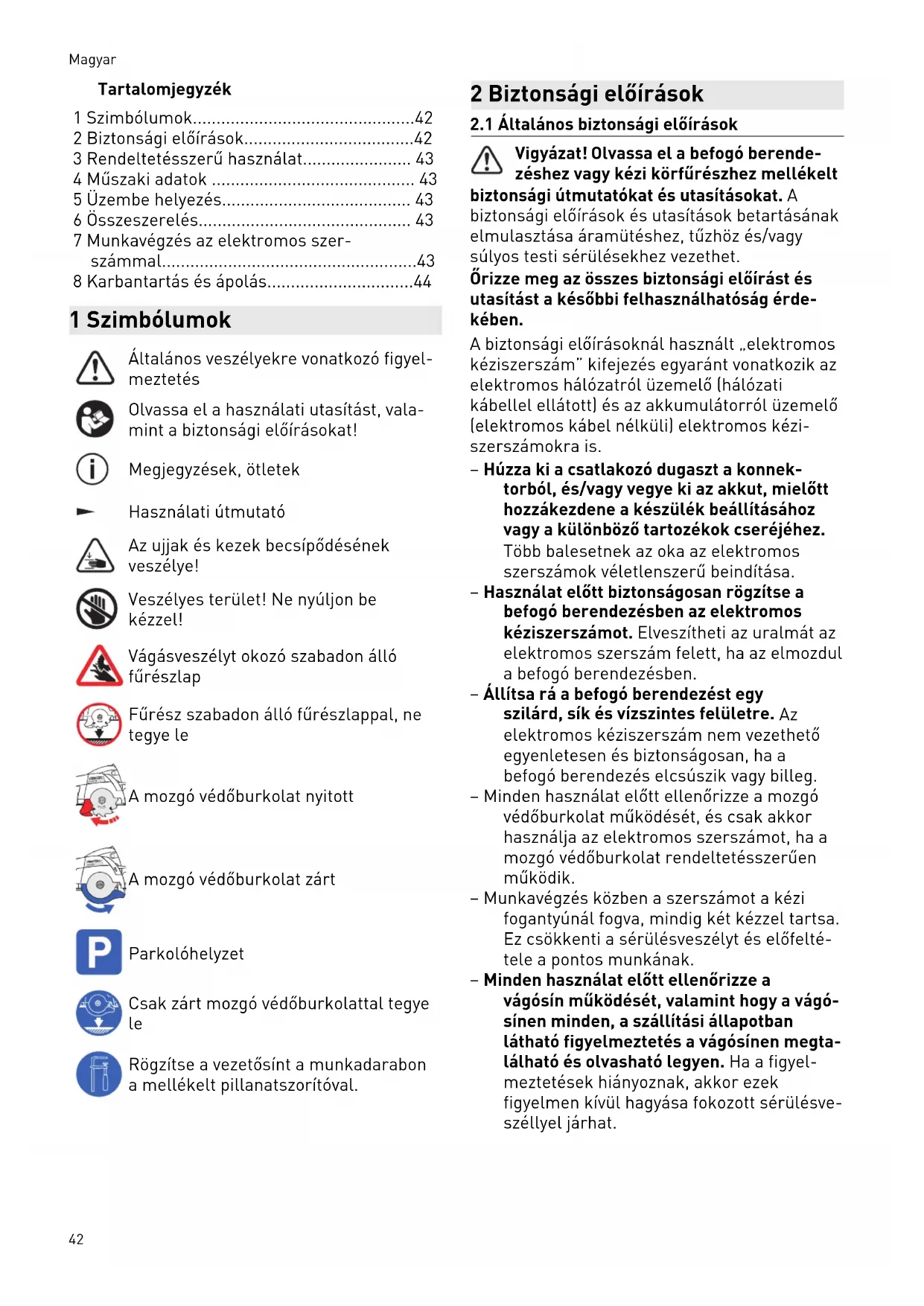 - 8 Karbantartás és ápolás 1 Szimbólumok Általános veszélyekre vonatkozó figyel meztetés Olvassa el a használati utasítást, vala mint a biztonsági előírásokat! Megjegyzések, ötletek Használati útmutató Az ujjak és kezek becsípődésének veszélye! Veszélyes terület! Ne nyúljon be kézzel! Vágásveszélyt okozó szabadon álló fűrészlap Fűrész szabadon álló fűrészlappal, ne tegye le HKC 55 EB www.fe p. 44