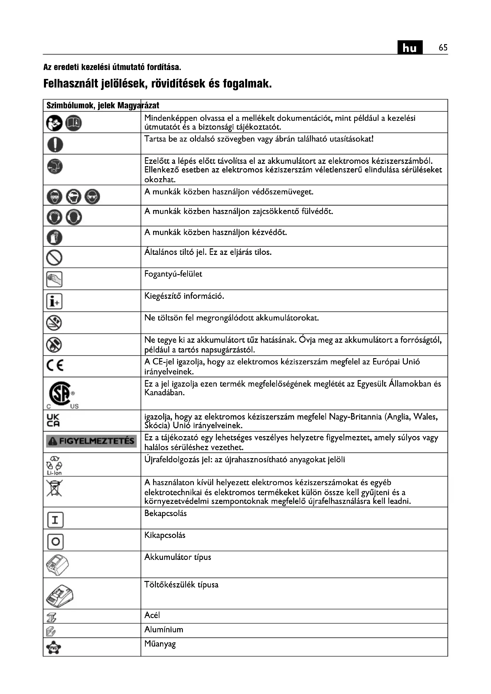Az eredeti kezelési útmutató fordítása. Felhasznált jelölések, rövidítések és fogalmak. Szimbólumok, jelek Magyarázat Mindenképpen olvassa el a mellékelt dokumentációt, mint például a kezelési útmutatót és a biztonsági tájékoztatót. Tartsa be az oldalsó szövegben vagy ábrán található utasításokat! Ezelőtt a lépés előtt távolítsa el az akkumulátort az elektromos kéziszerszámból. Ellenkező esetben az elektromos kéziszerszám véletlenszerű elindulása sérüléseket okozhat. A munkák közben használjon védőszemüveget. A munkák közben használjon zajcsökkentő fülvédőt. A munkák közben használjon kézvédőt. Általános tiltó jel. Ez az eljárás tilos. Fogantyú-felület Kiegészítő információ. Ne töltsön fel megrongálódott akkumulátorokat. Ne tegye ki az akkumulátort tűz hatásának. Óvja meg az akkumulátort a forróságtól, például a tartós napsugárzástól. A CE-jel igazolja, hogy az elektromos kéziszerszám megfelel az Európai Unió irányelveinek. Ez a jel igazolja ezen termék megfelelőségének meglétét az Egyesült Államokban és Kanadában. igazolja, hogy az elektromos kéziszerszám megfelel Nagy-Britannia (Anglia, Wales, Skócia) Unió irányelveinek. Ez a tájékozató egy lehetséges veszélyes helyzetre figyelmeztet, amely súlyos vagy halálos sérüléshez vezethet. Újrafeldolgozás jel: az újrahasznosítható anyagokat jelöli A használaton kívül helyezett elektromos kéziszerszámokat és egyéb elektrotechnikai és elektromos termékeket külön össze kell gyűjteni és a környezetvédelmi szempontoknak megfelelő újrafelhasználásra kell leadni. Bekapcsolás Kikapcsolás Akkumulátor típus Töltőkészülék típusa Acél Alumínium Műanyag66