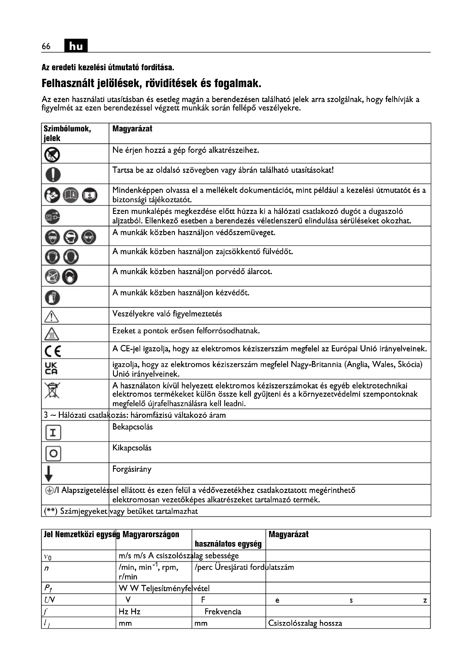 Az eredeti kezelési útmutató fordítása. Felhasznált jelölések, rövidítések és fogalmak. Az ezen használati utasításban és esetleg magán a berendezésen található jelek arra szolgálnak, hogy felhívják a figyelmét az ezen berendezéssel végzett munkák során fellépő veszélyekre. Szimbólumok, jelek Magyarázat Ne érjen hozzá a gép forgó alkatrészeihez. Tartsa be az oldalsó szövegben vagy ábrán található utasításokat! Mindenképpen olvassa el a mellékelt dokumentációt, mint például a kezelési útmutatót és a biztonsági tájékoztatót. Ezen munkalépés megkezdése előtt húzza ki a hálózati csatlakozó dugót a dugaszoló aljzatból. Ellenkező esetben a berendezés véletlenszerű elindulása sérüléseket okozhat. A munkák közben használjon védőszemüveget. A munkák közben használjon zajcsökkentő fülvédőt. A munkák közben használjon porvédő álarcot. A munkák közben használjon kézvédőt. Veszélyekre való figyelmeztetés Ezeket a pontok erősen felforrósodhatnak. A CE-jel igazolja, hogy az elektromos kéziszerszám megfelel az Európai Unió irányelveinek. igazolja, hogy az elektromos kéziszerszám megfelel Nagy-Britannia (Anglia, Wales, Skócia) Unió irányelveinek. A használaton kívül helyezett elektromos kéziszerszámokat és egyéb elektrotechnikai elektromos termékeket külön össze kell gyűjteni és a környezetvédelmi szempontoknak megfelelő újrafelhasználásra kell leadni. 3 ~ Hálózati csatlakozás: háromfázisú váltakozó áram Bekapcsolás Kikapcsolás Forgásirány /I Alapszigeteléssel ellátott és ezen felül a védővezetékhez csatlakoztatott megérinthető elektromosan vezetőképes alkatrészeket tartalmazó termék. (**) Számjegyeket vagy betűket tartalmazhat Jel Nemzetközi egység Magyarországon használatos egység Magyarázat