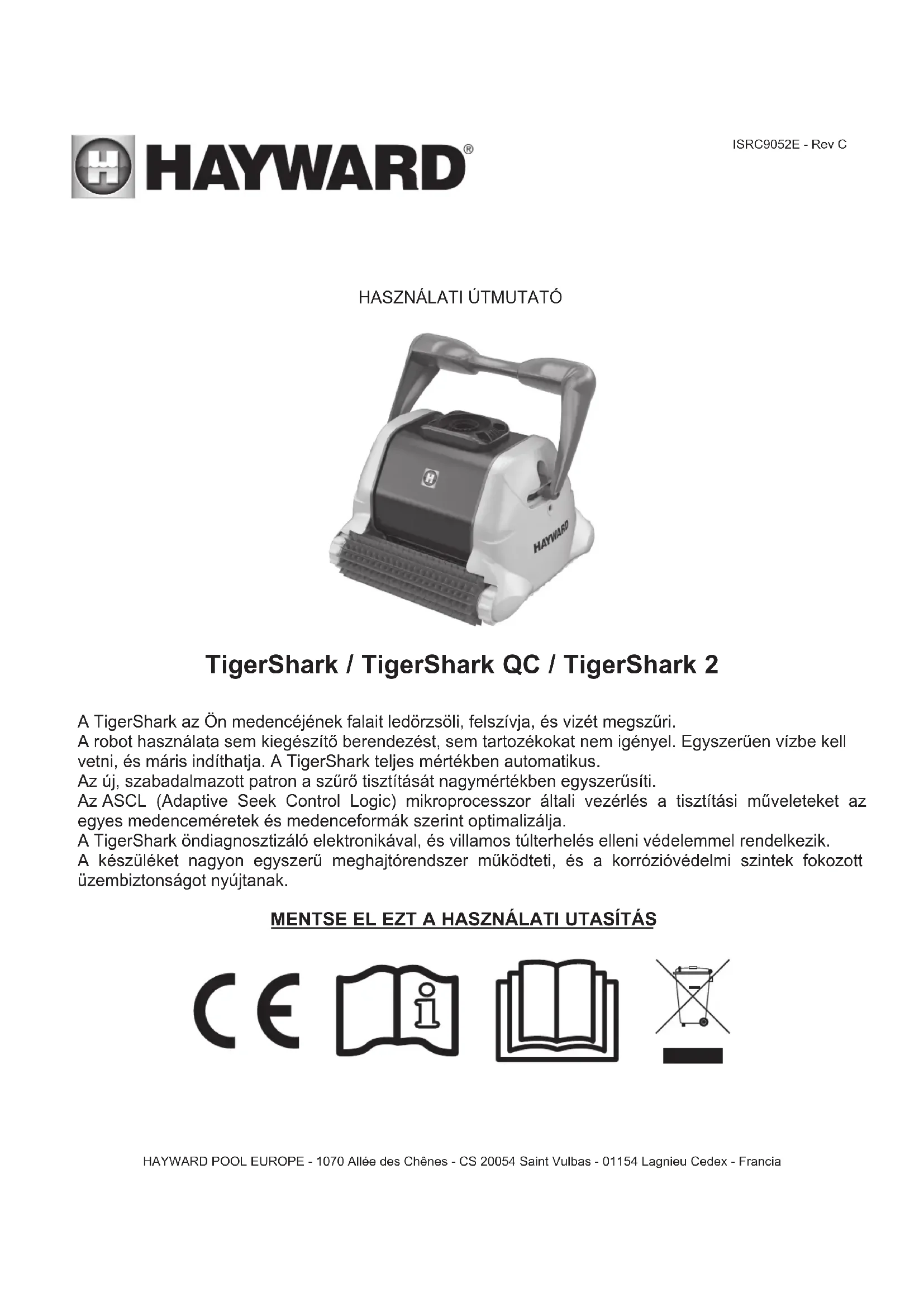Undlad at bruge rengøringsrobotten før poolen er klargjort efter vinteren. Til din information Bemærk BRUGERVEJLEDNINGA TigerShark az Ön medencéjének falait ledörzsöli, felszívja, és vizét megszűri. A robot használata sem kiegészítő berendezést, sem tartozékokat nem igényel. Egyszerűen vízbe kell vetni, és máris indíthatja. A TigerShark teljes mértékben automatikus. Az új, szabadalmazott patron a szűrő tisztítását nagymértékben egyszerűsíti. Az ASCL (Adaptive Seek Control Logic) mikroprocesszor általi vezérlés a tisztítási műveleteket az egyes medenceméretek és medenceformák szerint optimalizálja. A TigerShark öndiagnosztizáló elektronikával, és villamos túlterhelés elleni védelemmel rendelkezik. A készüléket nagyon egyszerű meghajtórendszer működteti, és a korrózióvédelmi szintek fokozott üzembiztonságot nyújtanak. MENTSE EL EZT A HASZNÁLATI UTASÍTÁS HAYWARD POOL EUROPE - 1070 Allée des Chênes - CS 20054 Saint Vulbas - 01154 Lagnieu Cedex - Francia ISRC9052E - Rev C