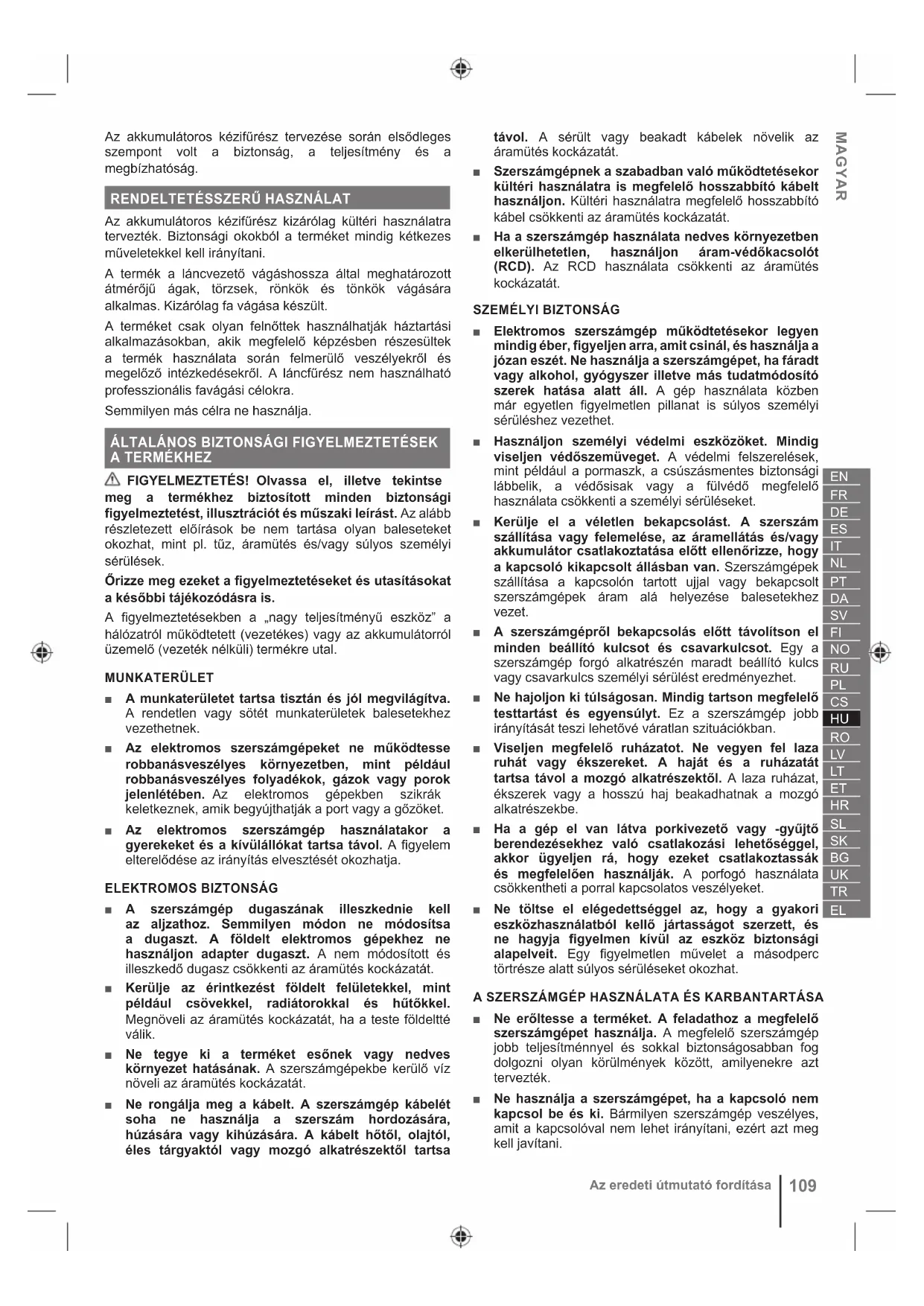 ■ Vegyen részt professzionálisan szervezett tanfolyamon a kézifűrészek használatáról és karbantartásáról, a megelőző lépésekről és az elsősegélyről. Tartsa meg a kézikönyvet, hátha a későbbiekben szüksége lehet rá. ■ A kézifűrészek potenciálisan veszélyes eszközök. A kézifűrész használatával járó balesetek gyakran a végtagok elvesztésével vagy halállal végződnek. A leeső ágak, kidőlő fák, guruló rönkök is ölhetnek. A beteg vagy rothadó tönkök további veszélyt jelentenek. Minden erejével a feladat biztonságos befejezésére kell összpontosítania. Bármilyen kétség esetén hagyja a munkát egy profi favágóra. ■ Ne vágjon szőlőtőkét és/vagy kisméretű bozótot (30 mm-nél kisebb átmérőjűt). ■ A termék első kezelésekor ajánlott rönkök vágását fűrészbakon vagy állványon gyakorolni. ■ A munkaterület mérete függ a végrehajtandó munkától, és a fa méretétől, vagy a munkadarab nagyságától. A kezelőnek ébernek kell lennie, és oda kell figyelnie mindenre a munkaterületen. ■ Ne tegyen előre-hátra fűrészelő mozdulatokat. Hagyja, hogy a lánc végezze a munkát. A láncot tartsa éles állapotban és ne próbálja meg a vágáson áttolni azt. ■ Ne fejtsen ki nyomóerőt a láncfűrészre a vágás végén. Legyen készen, hogy átvegye a fűrész súlyát, amint az kiszabadul a vágásból. Ha nem így tesz, súlyos személyi sérülés lehet az eredmény. ■ Ne állítsa le a fűrészt a vágási művelet közepén. Addig működtesse a fűrészt, amíg ki nem veszi a vágásból. ■ A forgó alkatrészek megérintése miatt keletkező sérülés kockázatának csökkentésére minden esetben állítsa le a terméket, vegye ki az akkumulátort és győződjön meg arról, hogy minden mozgó alkatrész teljesen megállt: ● tisztítás vagy eltömődés megszüntetése előtt ● mielőtt magára hagyná a terméket ● mielőtt felszerelné vagy eltávolítaná a tartozékokat ● ellenőrzés, karbantartás vagy a gépen végzett bármilyen művelet megkezdése előtt ■ Hosszabb használat sérülést okozhat. Ha a terméket hosszabb ideig használja, ügyeljen arra, hogy rendszeresen tartson szünetet. ■ Ha a gép leesett, erős ütést kapott vagy rendellenesen kezd vibrálni, azonnal állítsa le a gépet, és vizsgálja át sérülések tekintetében vagy azonosítsa a vibráció okát. Minden sérülést hivatalos szervizközpontban kell megjavíttatni vagy kicseréltetni. ■ Csak 0 °C és 40 °C közötti hőmérsékleten használja a készüléket. ■ A készüléket -10 °C és 50 °C közötti hőmérsékleten tárolja. SZEMÉLYI VÉDELMI ESZKÖZÖK A szakemberek által is használt, jó minőségű személyi védőfelszerelés, segít csökkenteni az üzemeltető sérülésének kockázatát. A termék működtetésekor használja a következő cikkeket: ■ Védősisak – meg kell felelnie az EN 397 szabványnak, és CE jelöléssel kell rendelkeznie ■ Fülvédő – meg kell felelnie az EN 352-1 szabványnak, és CE jelöléssel kell rendelkeznie ■ Szem- és arcvédő – CE jelöléssel kell rendelkeznie és meg kell felelnie az EN 166 (a védőszemüvegek esetében) vagy az EN 1731 (hálós arcvédő esetében) szabványnak112 Az eredeti útmutató fordítása ■ Kesztyűk – meg kell felelnie az EN ISO 11393-4 szabványnak, és CE jelöléssel kell rendelkeznie ■ Lábvédelem (vágásálló) – meg kell felelnie az EN ISO 11393-2 szabványnak és CE jelöléssel kell rendelkeznie, és teljes körű védelmet kell nyújtania. ■ A kézifűrészhez használt biztonsági lábbelinek – meg kell felelnie az EN ISO 20345:2004 szabványnak, és az EN ISO 11393-3 szabványnak való megfelelés érdekében egy kézifűrészt ábrázoló pajzzsal kell jelölni. (Az alkalmi felhasználók használhatnak acél orrmerevítővel ellátott biztonsági lábbelit is lábszárvédőkkel, ami megfelel az EN ISO 11393-5 szabványnak, ha a talaj egyenletes és kicsi az aljnövényzetbe való felbukás vagy beakadás esélye) ■ Védőkabát a kézifűrészhez a felsőtest védelme érdekében – meg kell felelnie az EN ISO 11393-6 szabványnak, és CE jelöléssel kell rendelkeznie AZ AKKUMULÁTOR KIEGÉSZÍTŐ BIZTONSÁGI FIGYELMEZTETÉSEI ■ A rövidzárlat általi tűz, sérülések vagy termékkárosodások veszélye elkerülésére ne merítse a szerszámot, a cserélhető akkut vagy a töltőkészüléket folyadékokba, és gondoskodjon arról, hogy ne hatoljanak folyadékok a készülékekbe és az akkukba. A korrozív hatású vagy vezetőképes folyadékok, mint pl. a sós víz, bizonyos vegyi anyagok, fehérítők vagy fehérítő tartalmú termékek, rövidzárlatot okozhatnak. ■ Olyan helyen töltse az akkumulátort, ahol a környezeti hőmérséklet 10 °C és 38 °C között van. ■ Az akkumulátort 0 °C és 20°C közötti hőmérsékleten tárolja. AZ ALAPVETŐ FAKIVÁGÁSI ÉS KERESZTVÁGÁSI